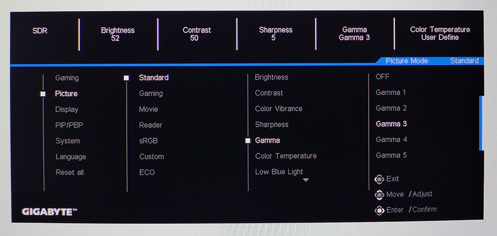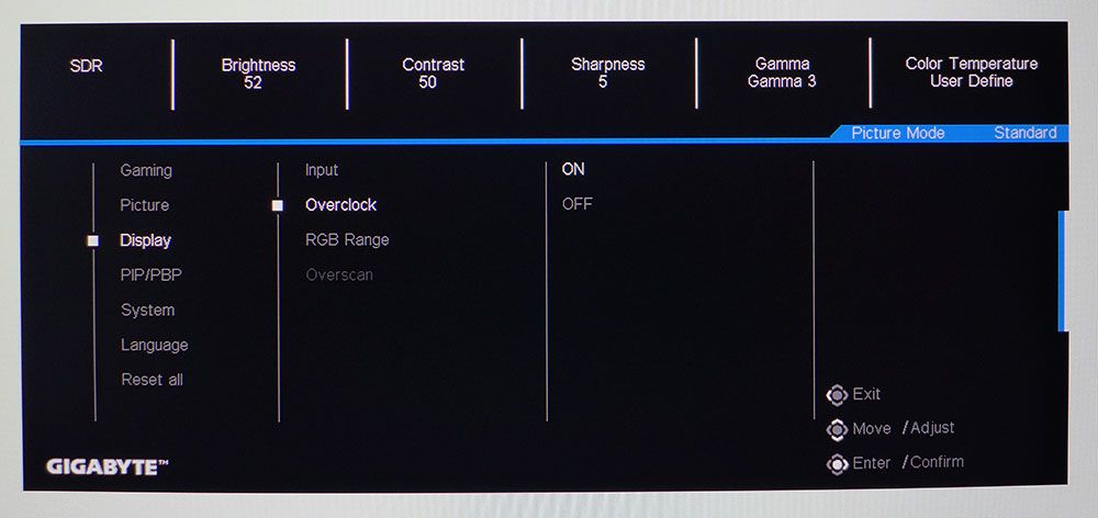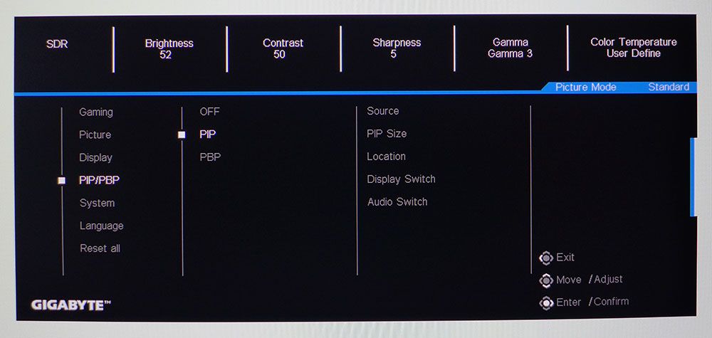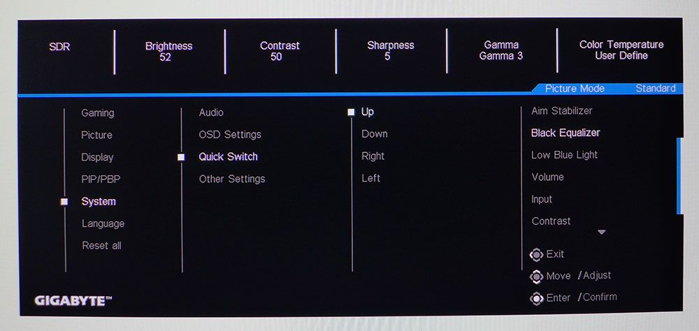 Os auxiliares de jogos incluem uma seleção de mira, juntamente com o GameAssist de Gigabyte que exibe taxas de quadros em tempo real e um conjunto de temporizadores. O OSD também fornece funções PIP e PBP e você pode programar o Joystick de controle para acesso rápido a funções comumente usadas.