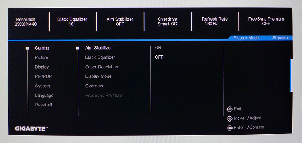 Os jogos estão em primeiro lugar com todas as opções de processamento de vídeo do GS27QXA. O AIM Stabilizer é o estroboscópio de luz de fundo e pode ser usado em vez de sincronização adaptativa. É uma das melhores implementações que já vi sem artefatos de fase e apenas uma redução de 10% de brilho. A 240 Hz, você não precisará disso, porque o overdrive inteligente é muito bom. Ele varia o ultrapassagem com as alterações na taxa de atualização e tem uma desvantagem zero, sem artefatos, sem barulho. Gigabyte realmente fez um bom trabalho com o processamento de vídeo do GS27QXA. E o overclock de 260 Hz? Vamos chegar a isso em um momento.