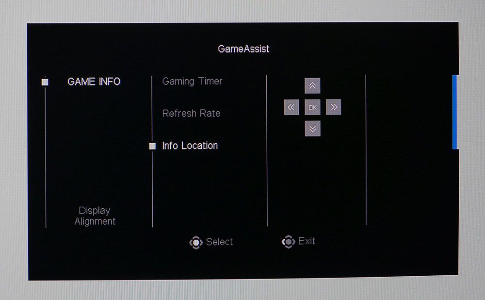 O interruptor rápido refere -se ao OSD Joystick e suas quatro direções são programáveis. Encontrei os padrões de modos de imagem, entradas e pontos de mira para estar bem para meus propósitos. O GS27QXA inclui uma versão reduzida do gameassist de Gigabyte. Aqui, inclui quatro mira, temporizadores, marcas de alinhamento e um indicador de taxa de atualização. A janela de informações pode ser movida pela tela usando o joystick.