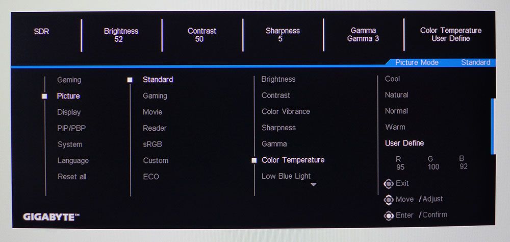 Existem sete modos de imagem, com o padrão sendo a melhor escolha e a melhor escolha. Inclui cinco predefinições gama, quatro temperaturas de cores fixas e um modo de usuário com controles RGB. O GS27QXA sai da caixa, parecendo um pouco quente para que a calibração seja recomendada. Com alguns ajustes, uma maior precisão pode ser alcançada e a diferença é visível.