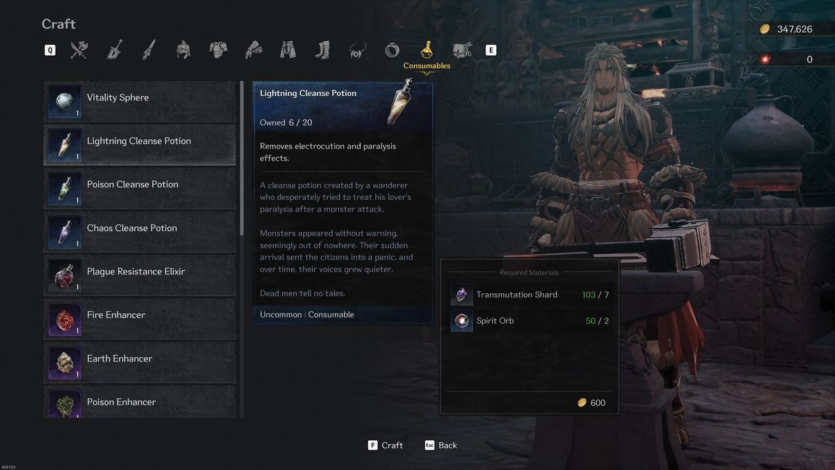 Uma vez que você Desbloqueie o ferreiroVocê poderá começar a usar todos esses fragmentos de transmutação e orbes espirituais que você coleta de inimigos para criar consumíveis. Selecione Artesanato com o ferreiro e passear até o extremo direito, onde a guia Consumíveis é mostrada com uma pequena garrafa de poção.