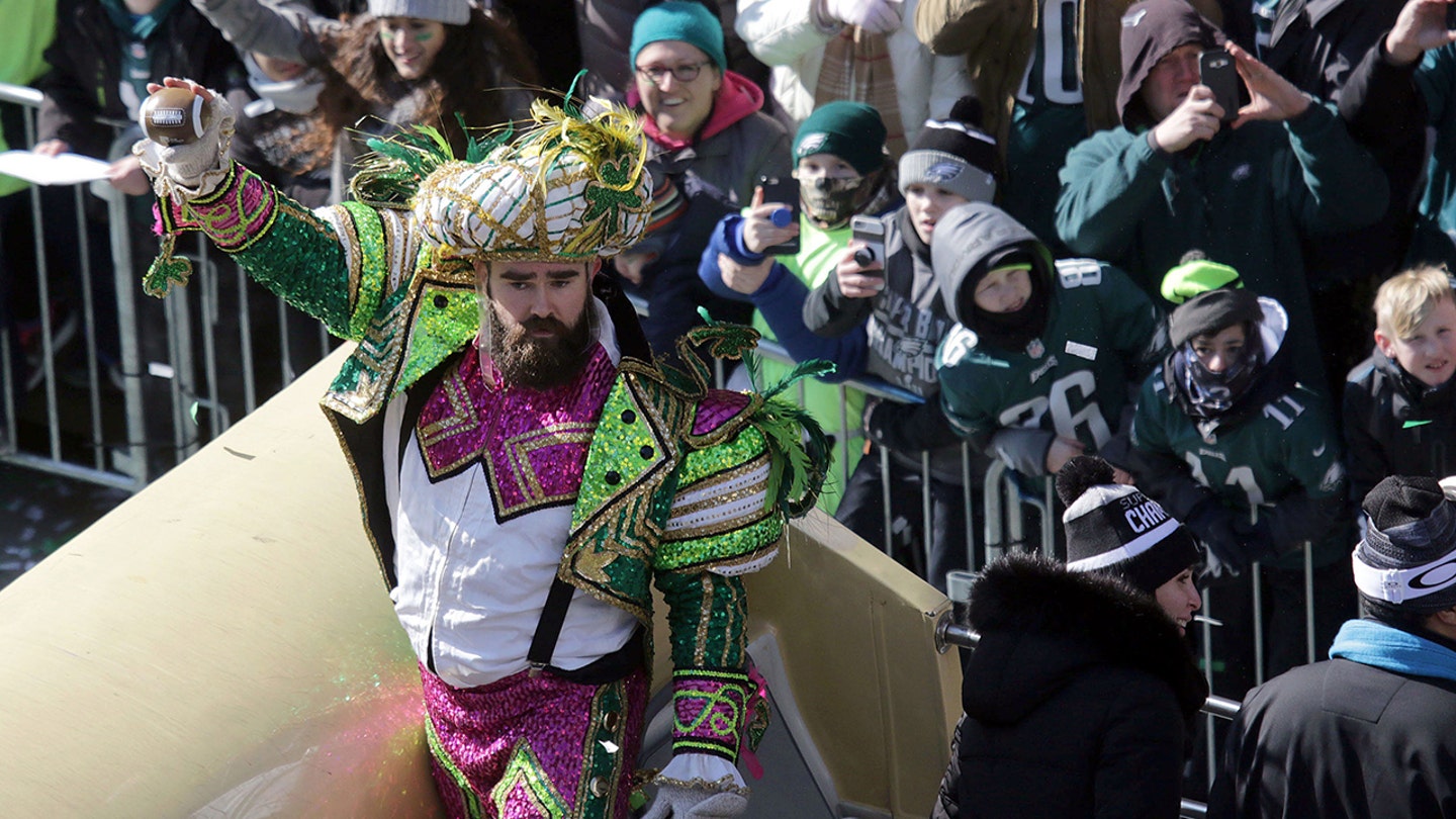 O Centro de Philadelphia Eagles, Jason Kelce, celebra seu primeiro campeonato do Super Bowl com um desfile na Broad Street até o Museu de Arte da Filadélfia. (Imagn)