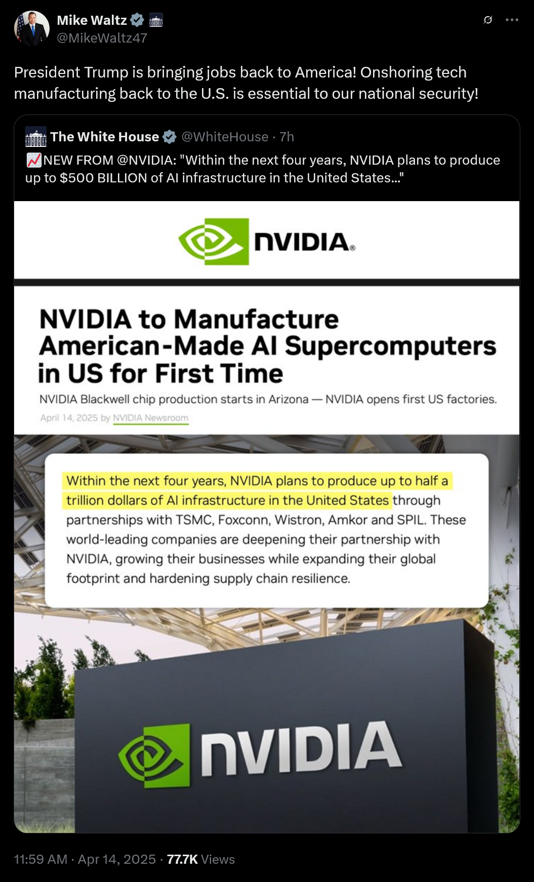 O governo Trump foi rápido em receber crédito pelo anúncio da Nvidia, chamando -o “o efeito Trump em ação.” But others have said the move is not the result of current policies but rather the CHIPS Act, signed into law in 2022 during the Biden administration: TSMC, one of the manufacturing partners named in the Nvidia announcement, received nearly $12 billion in direct funding and loans as a result of the CHIPS Act. Ironically, Trump has previously expressed a desire to kill the act, calling it a “horrible, horrible thing” in March and saying the same results could be alcançado através da imposição de tarifas.