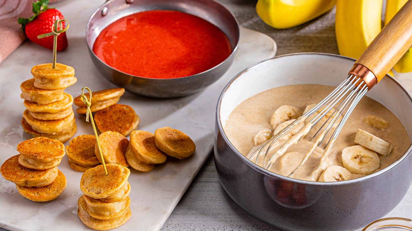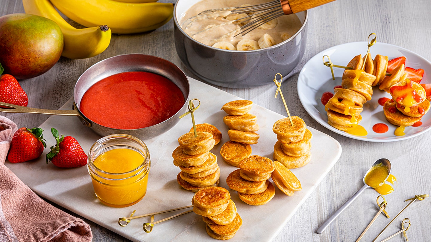 Mini panquecas de banana são servidas com molho de frutas. (Dole Food Co.)