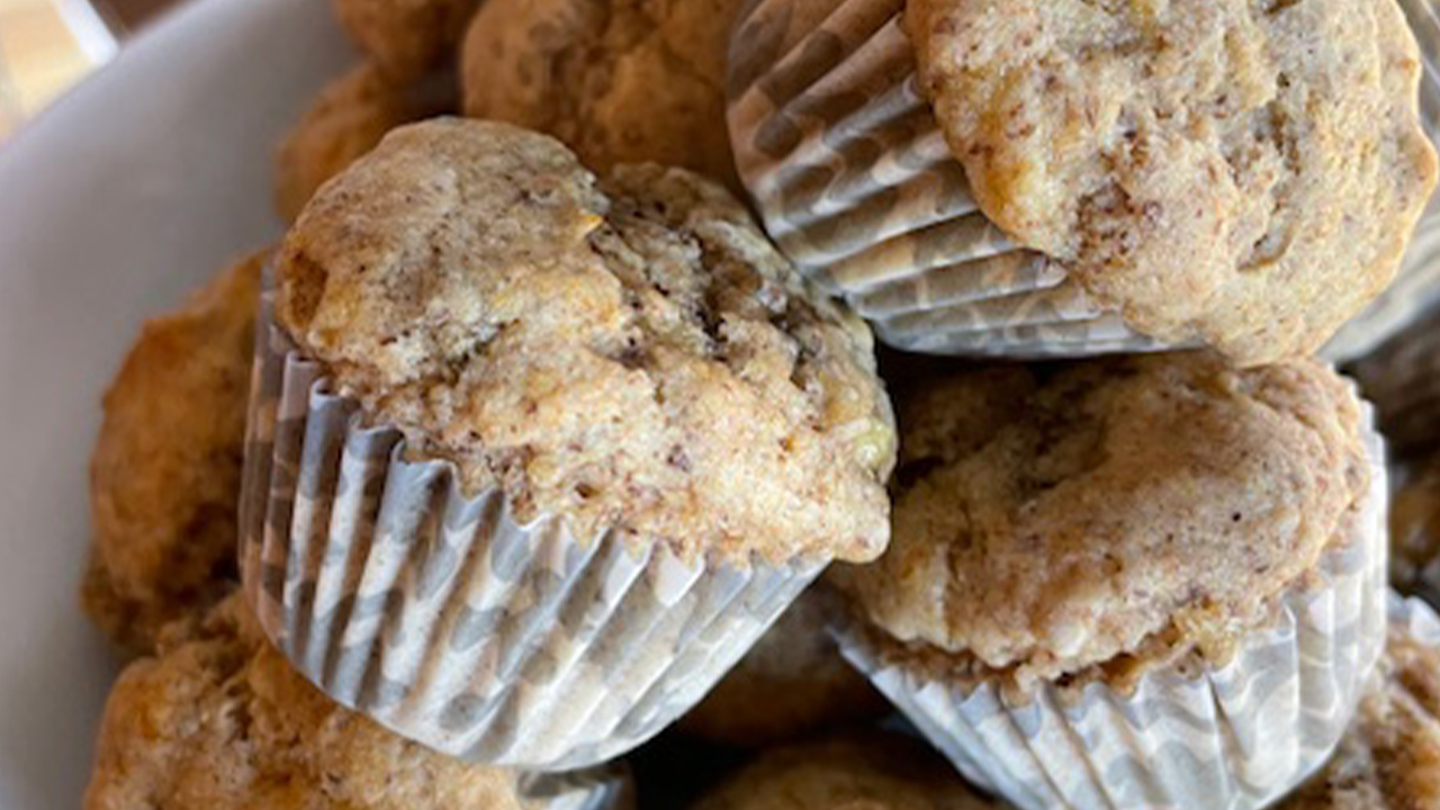 Esses muffins de banana sem ovos usam banana como substituto dos ovos. (Miss Nutritive Eats)