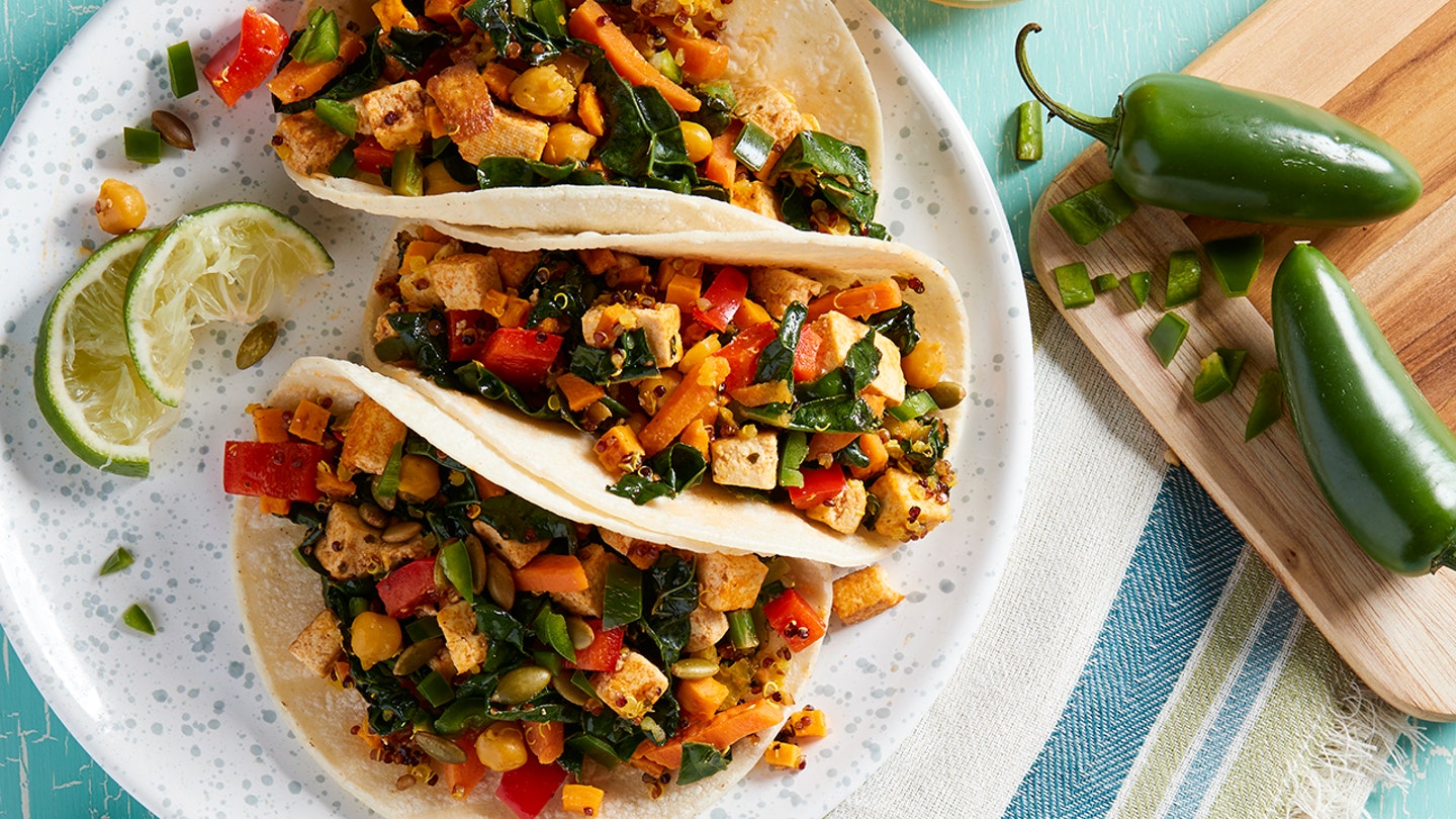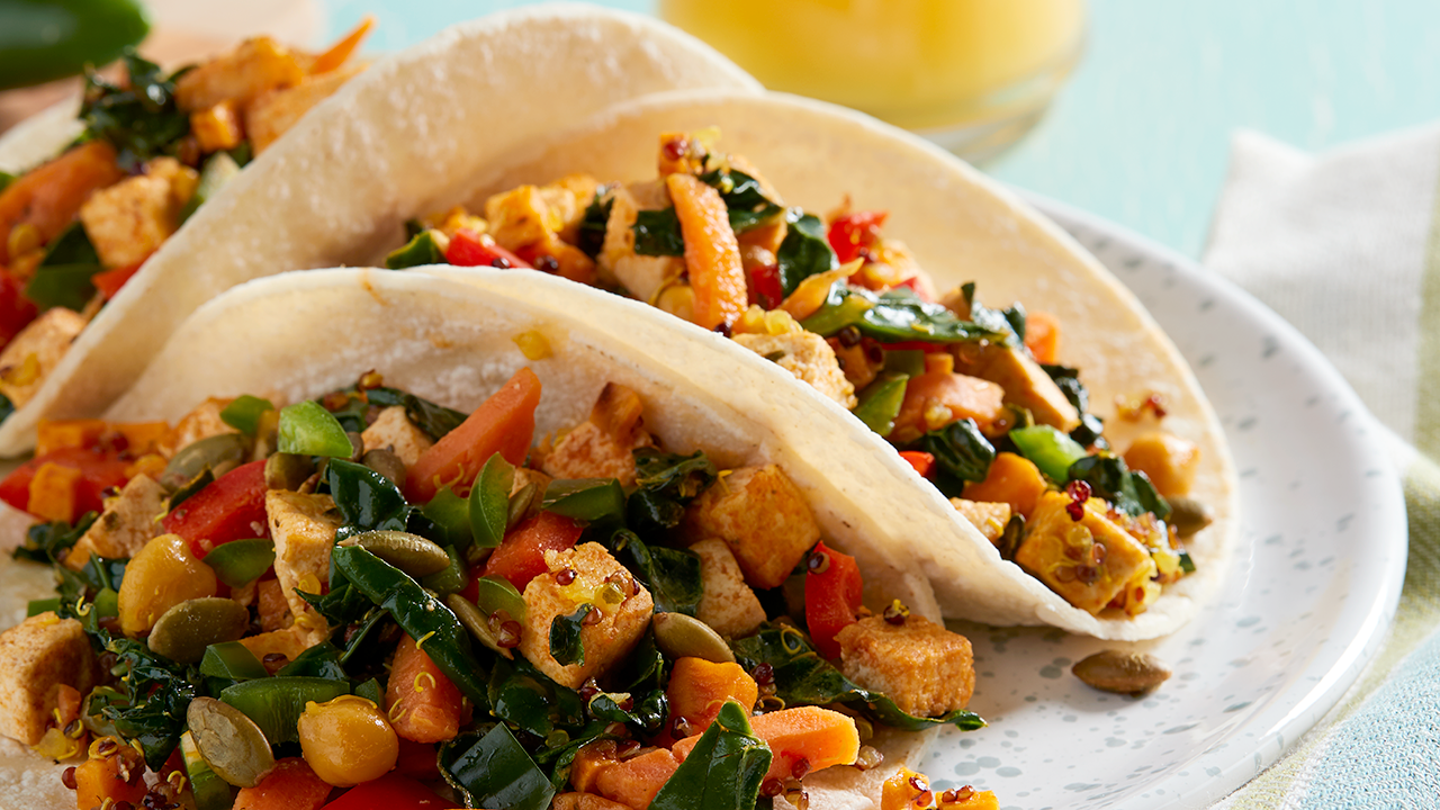As tacos de café da manhã cheias de proteínas são feitas com tofu, batata-doce e vários pimentões. (Dole Food Co.)
