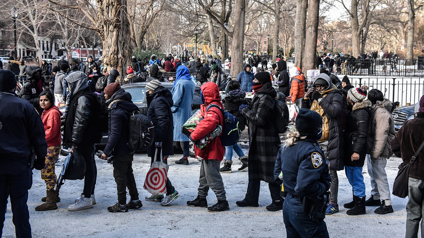 Os migrantes sem -teto esperam na fila para receber doações de alimentos e roupas no Tompkins Square Park em 20 de janeiro de 2024 na cidade de Nova York. (Stephanie Keith/Getty Images)