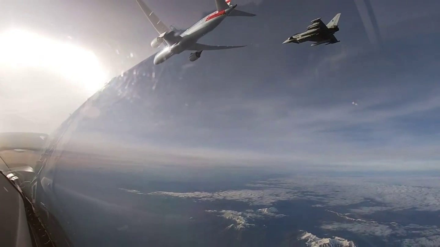 O vídeo mostra o avião sendo escoltado por jatos da Força Aérea Italiana antes de aterrissar no Aeroporto Internacional Leonardo da Vinci em Roma.