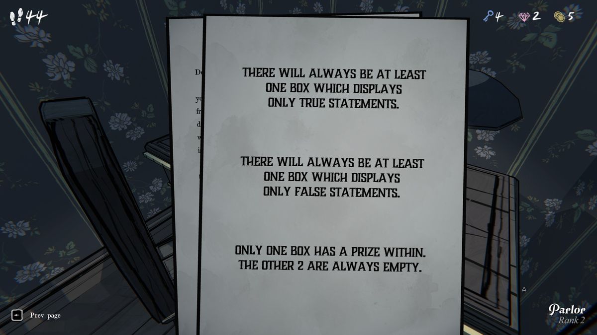 Como mencionado, você precisará pegar a chave de vento para as caixas para desbloqueá -las. É importante lembrar que apenas porque uma caixa tem uma afirmação verdadeira, isso não significa que ela contém as jóias. Aqui está um exemplo de um dos primeiros quebra -cabeças que enfrentei na sala e como cheguei à conclusão. Você poderá usar uma abordagem semelhante se estiver preso.