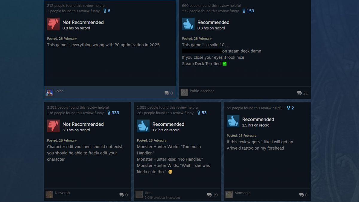 Obviamente, nem toda revisão é (justificadamente) lamentando os problemas de desempenho. “A jogabilidade é a melhor em qualquer jogo de MH até agora. A história é sólida, os personagens são legais e engraçados e a equipe de design (fez) um bom trabalho”, um Revisor do Steam escreveu. “Quase todo conjunto de armaduras parece Endgame Gear!” Outro revisor chamado Wilds Uma “recomendação fácil”, dizendo que foi um “passo incrível para a franquia MH. Muitas arestas acalmadas, excelente integração para novos jogadores e algumas atualizações realmente incríveis de armas”. Outras chamadas para a jogabilidade estão enterradas entre todos os memes inevitáveis e críticas falsas positivas, embora mesmo alguns deles continuem mencionando que o jogo precisa de otimizar.