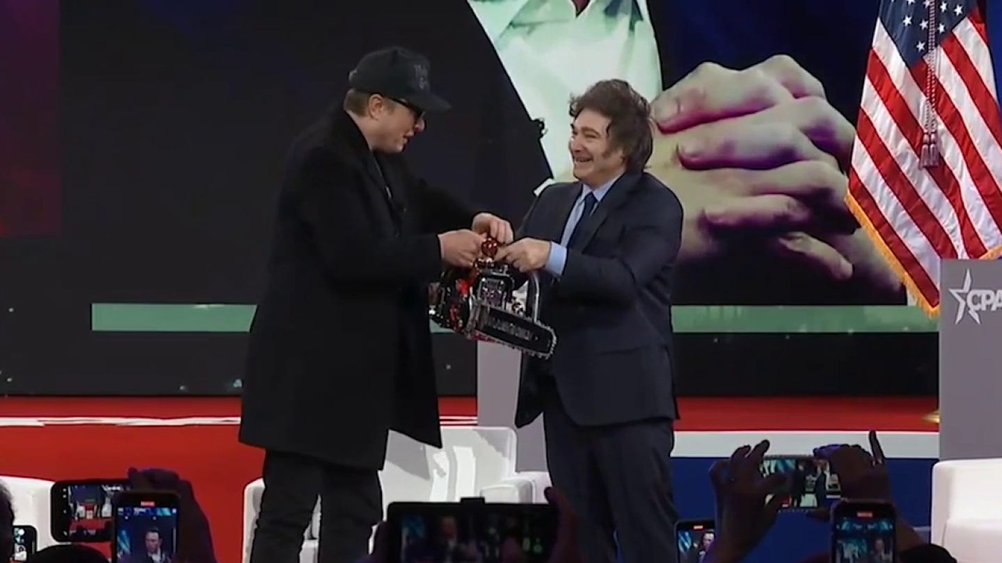 No início de seu discurso, o chefe do Doge se juntou ao presidente argentino Javier Milei, que também é conhecido por cortar dramaticamente o tamanho do governo em seu país. Os dois homens empunharam uma falta de energia de volta a um vídeo viral de Milei e simbolizando seus objetivos compartilhados de reduzir o desperdício do governo.