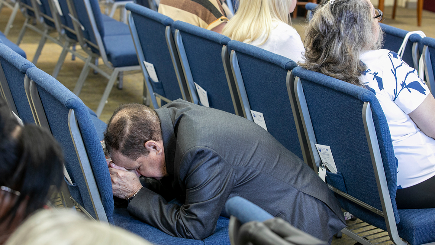 Um congregante se ajoelha em oração no Centro Cristiano El Pan de Vida, uma congregação de Deus de Deus de Deus, em Kissimmee, Flórida, domingo, 2 de fevereiro de 2025. (AP)