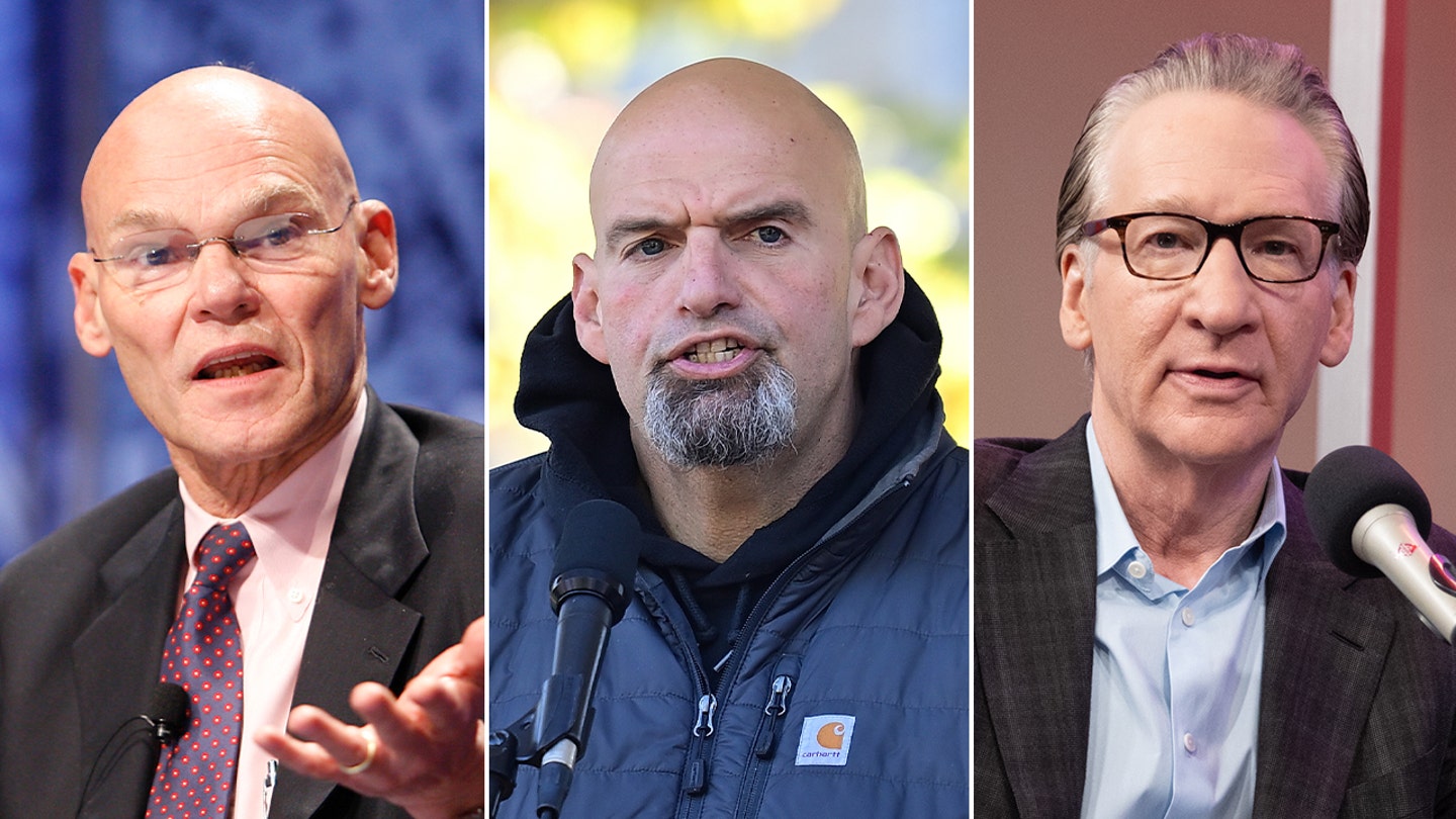 James Carville, John Fetterman e Bill Maher (L.To r.) São três democratas que alertaram o partido para não se tornarem desequilibrados sobre o presidente Trump. (Mark von Holden/WireImage/Mark Makela/Noam Galai)