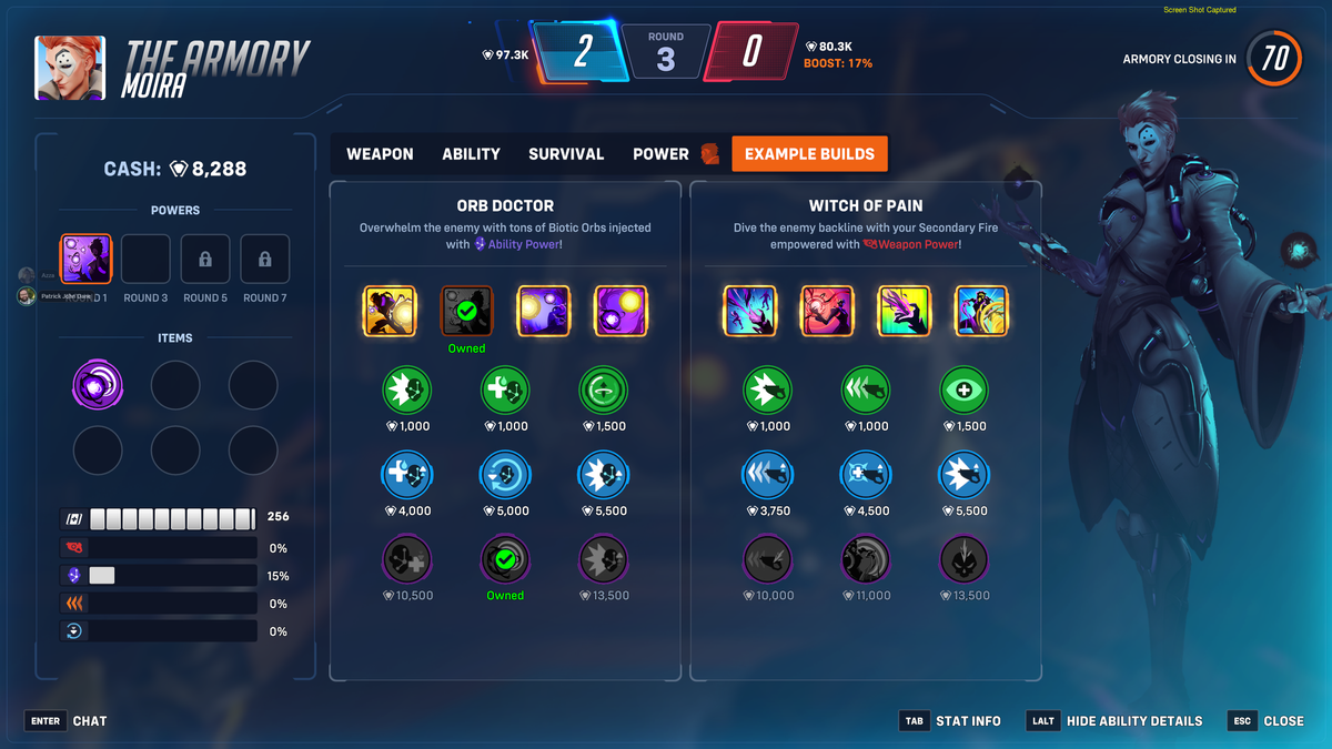 Então, a cada rodada ímpar, você escolhe uma potência de 12 opções. Estes são como super buffs, dando ao seu herói uma habilidade muito legal. É isso que você pode concentrar suas construções. Portanto, para Moira, há um exemplo de compilação chamado “Orb Doctor”, que eu realmente achei realmente útil, pois isso concentra toda a sua força em torno de sua capacidade de Orb biótica, com a energia multiball lançando duas esferas adicionais com 85% de eficácia reduzida e a energia cruzada-orbal que lança um orb biótico adicional do outro tipo com 50% de capacidade reduzida.