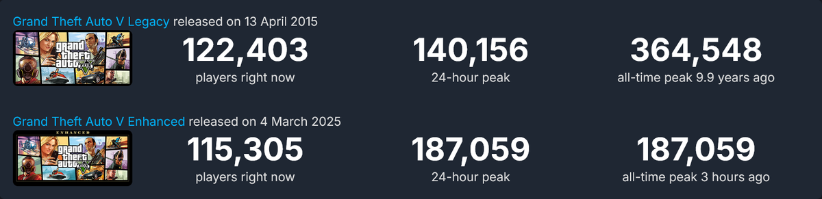 Também é interessante que, embora o GTA 5 Enhanced tenha entrado no top 10 do Steam, isso não o fez canibalizando o GTA 5 Legacy, a versão original do jogo que permanece disponível separadamente no Steam. Atualmente, a versão herdada tem cerca de 122.000 pessoas jogando, um pouco de uma queda dos números recentes, mas não muito longe de onde normalmente estaria, enquanto a edição aprimorada tem mais de 115.000 ao mesmo tempo.