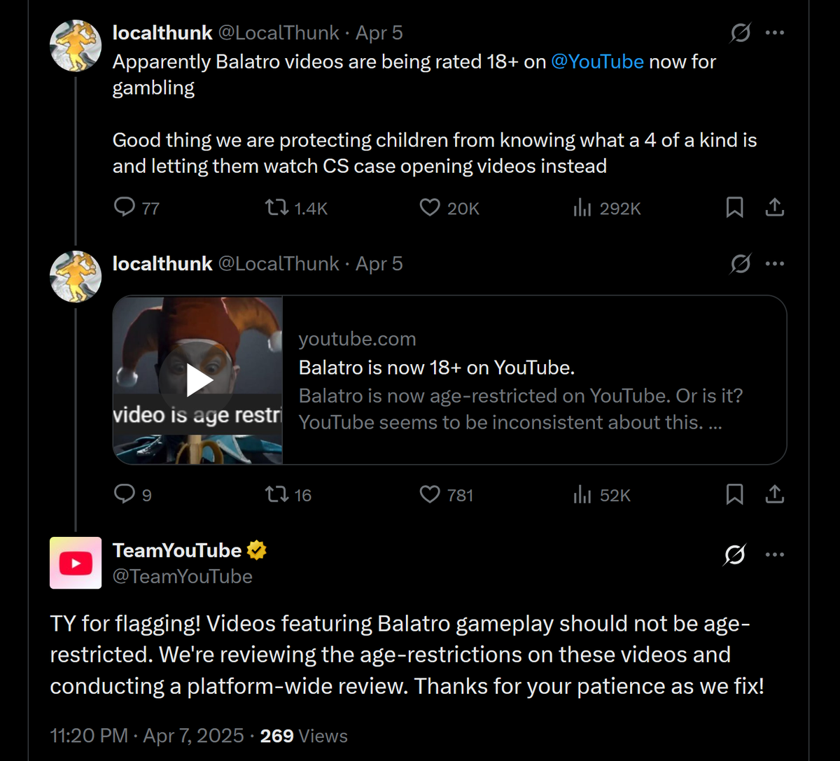 YouTube sugeriu que Balatro era vítima das recentes mudanças nas políticas do YouTube em Conteúdo relacionado ao jogo E como essas políticas são aplicadas, dizendo que recebe feedback sobre suas políticas de aplicação, pois continua a ajustar como são aplicadas. Também incentivou outros criadores de conteúdo que são atingidos com uma classificação de idade inadequada para arquivar um apelo.