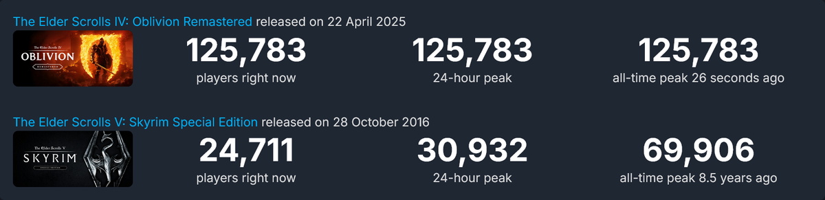 Lembre -se de que esse grande número se aplica apenas ao Steam: não é responsável pelos jogadores de consoles – a remasterizada da OBLIVION também está disponível no Xbox Series X/S e PlayStation 5 – ou aqueles que o buscam na Windows Store e também estão disponíveis no jogo. Também é relativamente cedo para os jogadores da América do Norte, muitos dos quais não serão capazes de mergulhar até que estejam em casa do trabalho ou da escola. Eu mantenho minha previsão de que a emoção desaparecerá rapidamente-é um videogame de 19 anos, afinal, e não é o melhor da série-mas agora também prevejo que o número continuará subindo por um bom tempo.