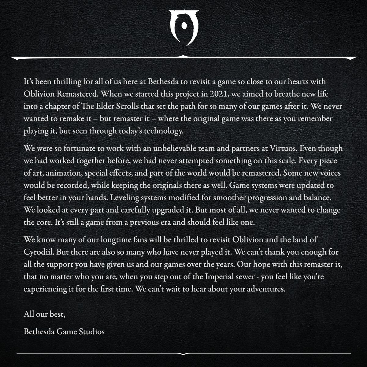 Bethesda aludiu a esse novo público em uma mensagem postada em Bluesky. “Sabemos que muitos de nossos fãs de longa data ficarão emocionados em revisitar o esquecimento e a terra de Cyrodiil”, escreveu o estúdio. “Mas também há muitos que nunca o jogaram.