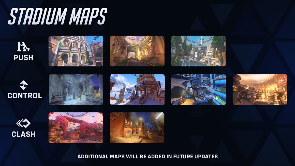 O estádio inclui três modos do jogo base e nove mapas no total, com mais mapas planejados para atualizações futuras. Alguns dos mapas do estádio são áreas novas ou retrabalhadas de locais existentes, como Busan ou Watchpoint: Gibraltar, enquanto alguns outros são completamente novos no Overwatch 2.