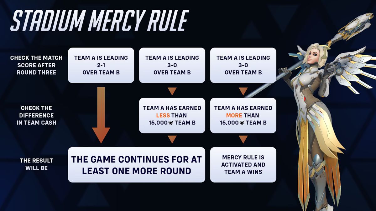 Essa regra permanece em vigor para o lançamento do Stadium, mas a Blizzard adicionou outra qualificação vinculada ao Stadium Cash. A regra da misericórdia ativa se uma equipe vencer as três primeiras rodadas e Tenha um total combinado de 15.000 em dinheiro do estádio mais do que a equipe perdida. O Stadium Awards Cash com base no desempenho em partidas, então a nova regra de misericórdia foi projetada para dar início apenas se ela realmente Parece que a equipe perdida tem uma baixa chance de aumentar um retorno. A Blizzard disse que a equipe está aberta para revisar a regra da misericórdia em futuras atualizações do estádio.