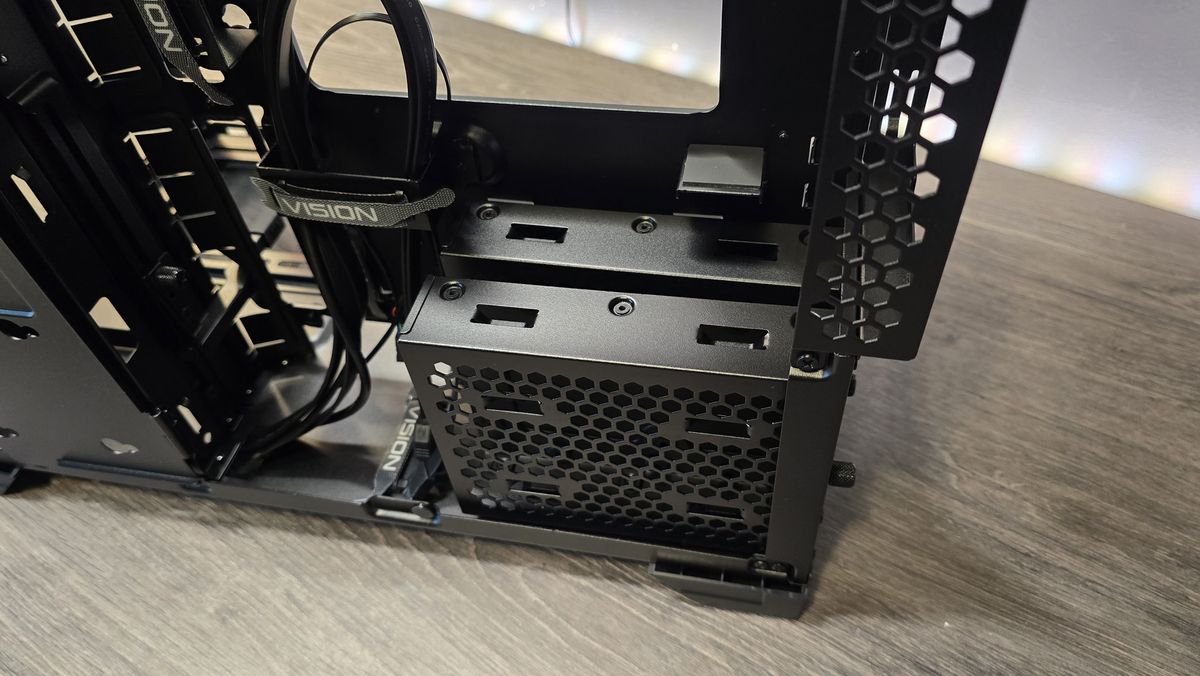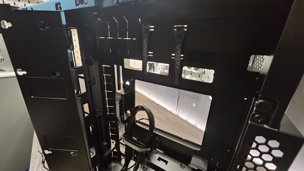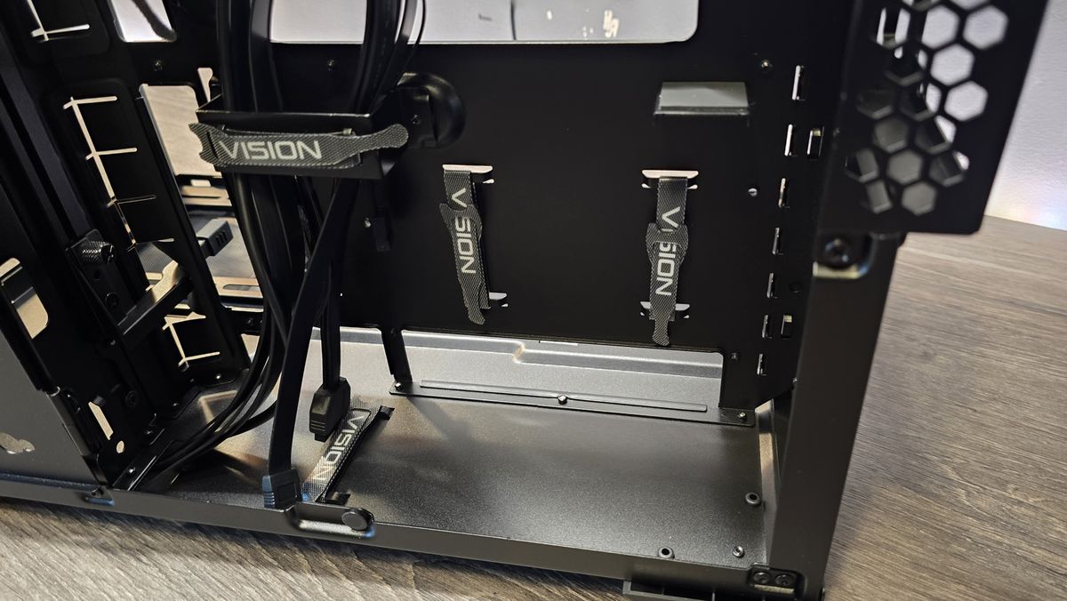 Em um mundo ideal, eu adoraria ver alguns canais de cabos de plástico aqui, em vez de apenas tiras de velcro, mas essa é uma irritação muito menor e, depois de remover as duas gaiolas de HDD de 3,5 polegadas abaixo, há muito espaço para amontoar o cabeamento lá se você desejar.