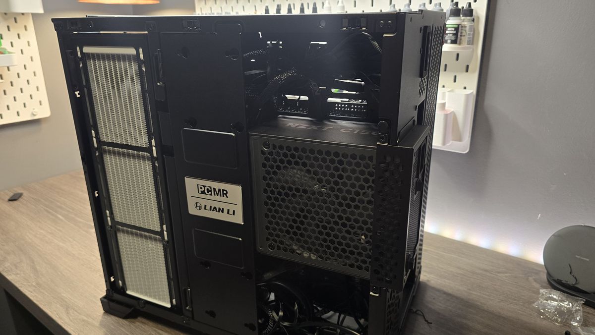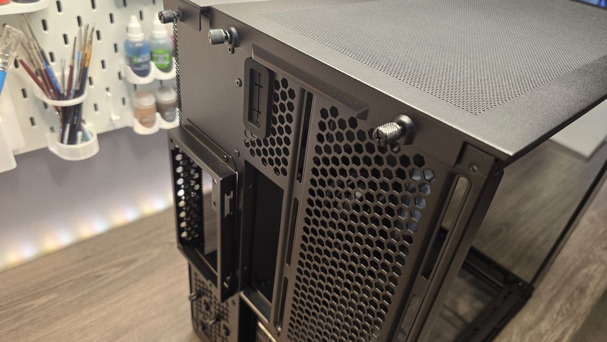 O gerenciamento de cabos na parte traseira também é bastante bem pensado. Existem muitos ilhós de borracha, juntamente com tiras de velcro e pontos de ligação ao longo da maior parte (algo que está se tornando muito menos comum nos dias de hoje, infelizmente). O Lian Li’s também incluiu uma porta de arrumação magnética para ajudar a esconder a maior parte da bagunça do cabo quando você terminar, e isso também abriga dois SSDs de 2,5 polegadas, balançando na posição protegida por ímãs colocados em ambos os lados. Isso é incrivelmente útil durante o processo de construção para mantê -lo fora do caminho, embora, para ser justo, você pode levantá -lo de suas dobradiças e removê -lo completamente. Quanto ao PSU, isso tem uma solução de montagem traseira saliente que se destaca em 15 mm, que honestamente não é o fim do mundo e oferece um pouco mais de espaço internamente para gerenciamento de cabos.