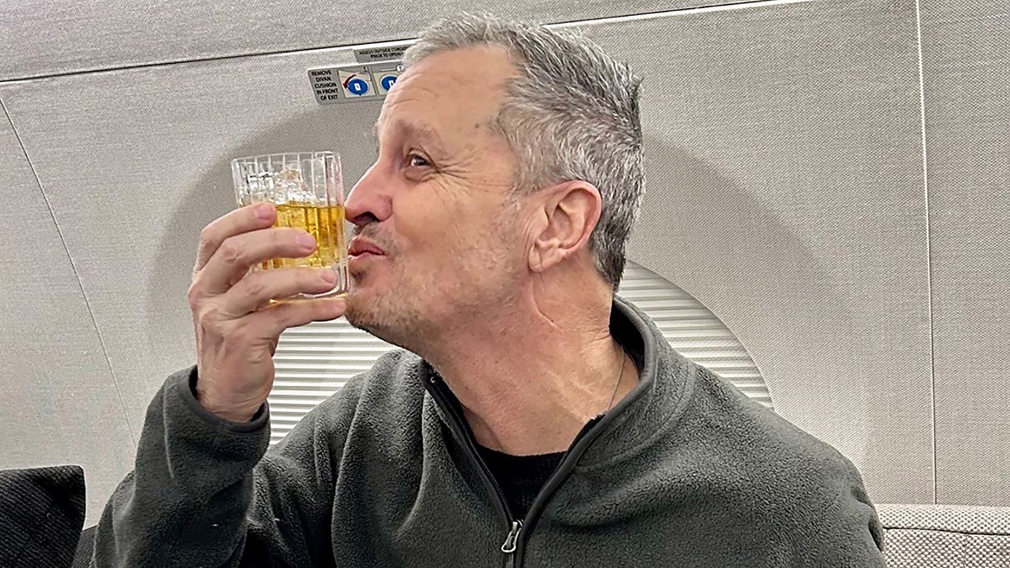 Marc Fogel, um professor americano detido na Rússia desde agosto de 2021, gesticula em um avião que o levou de volta aos Estados Unidos, depois que o enviado especial dos EUA, Steve Witkoff, garantiu sua libertação em 11 de fevereiro de 2025. (Adam Boehler/Folheto via Reuters)