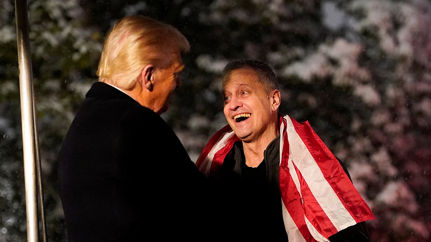 O presidente dos EUA, Donald Trump Greets, libertou o professor americano Marc Fogel, que era realizado na Rússia desde 2021, na Casa Branca em Washington, DC, 11 de fevereiro de 2025. (Reuters/Nathan Howard)