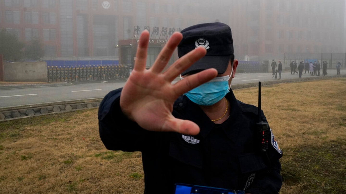 Uma pessoa de segurança afasta os jornalistas do Instituto de Virologia Wuhan na China em dezembro de 2021. (AP Photo/de Han Guan, arquivo)