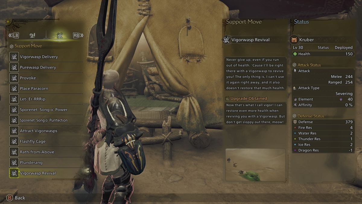 Outra maneira de fortalecer seu Palico é através de habilidades. O Rally Stick Habilidade, por exemplo, que aparece com destaque no conjunto de armaduras de Kunafa, aumenta o ataque e a defesa.