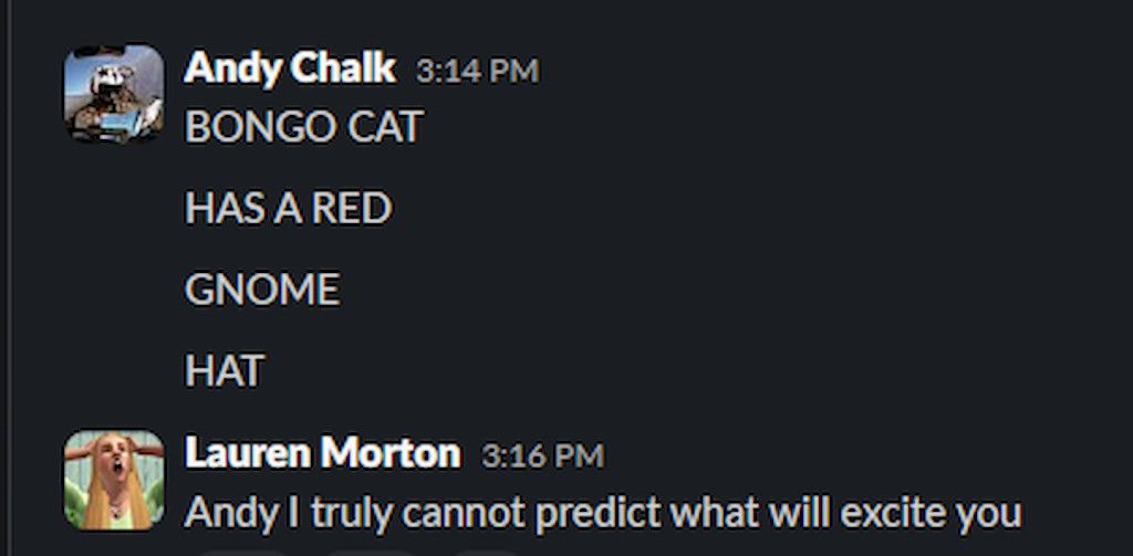 Ser livre é sem dúvida parte disso, assim como o fato de que, uma vez que o Bongo Cat está correndo, realmente não há razão para detê -lo. O Bongo Cat também ganha chapéus enquanto ele bate freneticamente no interior da minha tela, e eu tenho que admitir que minha descoberta desse fato levou a um emocionante momento compartilhado com meus colegas de trabalho.
