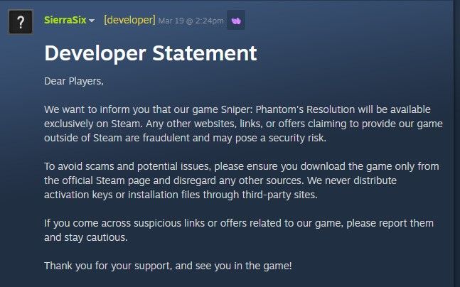 Em 16 de março, usuário Feral_wasp Chamado Sniper: a resolução da Phantom em uma postagem no subreddit de jogos para PC. Feral_wasp apontou que a página de vapor continha um link para o site do desenvolvedor e uma suposta demonstração do jogo, com Scuttle, mas é que a “demonstração” era na verdade malware.