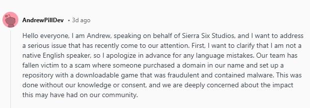 Andrew afirma que descobriu o malware por meio de sites de notícias polonesas e que o inglês não é seu primeiro idioma. Para ouvi -lo dizer, a equipe simplesmente não registrou o domínio SierrasixStudios.dev em tempo hábil, colocando -o na página de vapor como um espaço reservado antes de a concluir. Ele alega que um terceiro malicioso usou isso como um vetor de ataque. Aqui estão algumas de suas outras defesas: