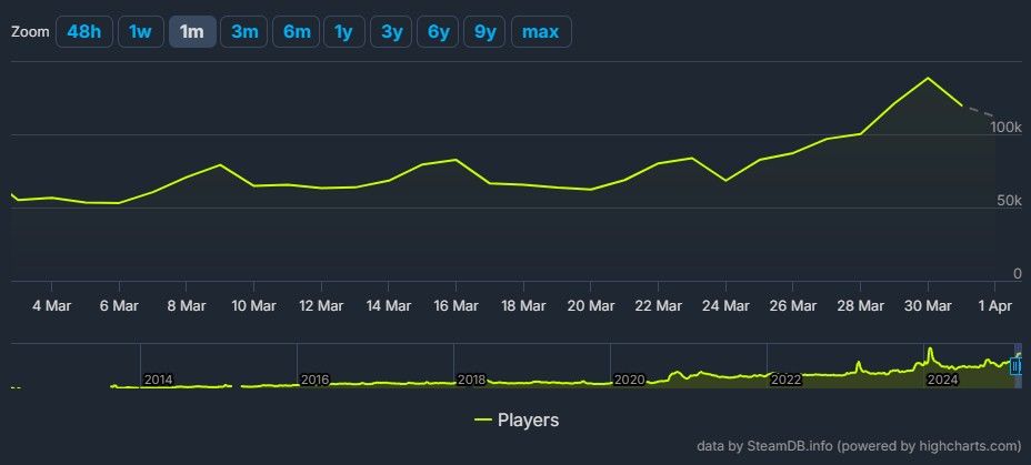 Então, por que o recente pico em números de guerra espacial? Se você olhar para seu gráfico de atividades do jogador No SteamDB, você pode notar que sua contagem de jogadores começou a aumentar constantemente em 24 de março – o mesmo dia em que o Anexo 1 foi lançado.