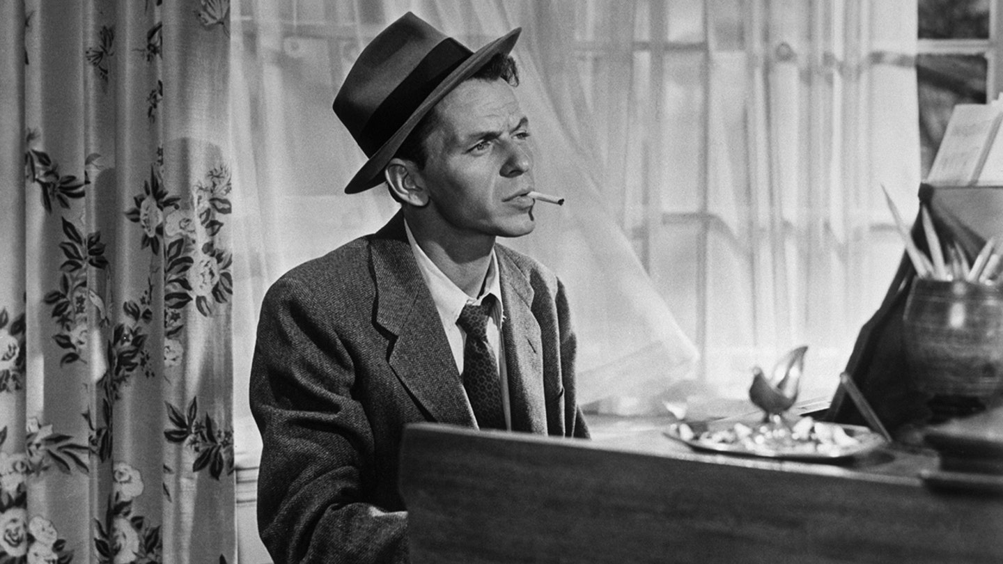 Em uma pose clássica, Frank Sinatra fuma um cigarro enquanto toca piano no filme “Young at Heart”. (Getty)