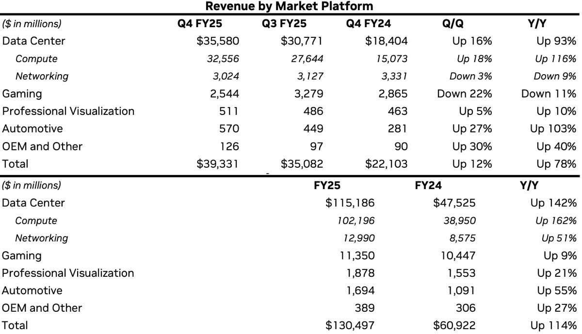 A NVIDIA registrou receita de US $ 39,33 bilhões no quarto trimestre do EF2025, marcando um aumento sequencial de 12% e um enorme crescimento de 78% ano a ano (YOY). O lucro líquido da empresa alcançou US $ 22,091 bilhões, pois suas margens brutas atingiram 73%, queda de 3% em comparação com o mesmo trimestre de um ano atrás, devido à rampa de Blackwell, bem como à produção de material Blackwell de baixo rendimento no trimestre anterior. Para o ano, a NVIDIA ganhou US $ 130.497 bilhões, um aumento de 114%. O lucro líquido da empresa foi de US $ 72,88 bilhões e sua margem bruta foi de 75%, um aumento de 2,3% em relação a 2024.