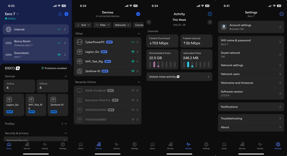 A guia principal da casa fornece o status da sua conexão com a Internet, o status dos nós do Eero conectado e uma lista rolável de clientes sem fio e com fio. A guia Dispositivos é auto-explicativa e oferece uma lista de clientes com fio e sem fio. A guia Atividade registra suas velocidades mais recentes da Internet gravada (download e upload), juntamente com os totais de dados cumulativos baixados e carregados semanalmente. Uma função da linha do tempo também oferece registros de data e hora para determinadas atividades de rede (ou seja, quando um nó Eero fica online, quando uma atualização foi realizada pela última vez, quando um novo cliente se junta, etc.).