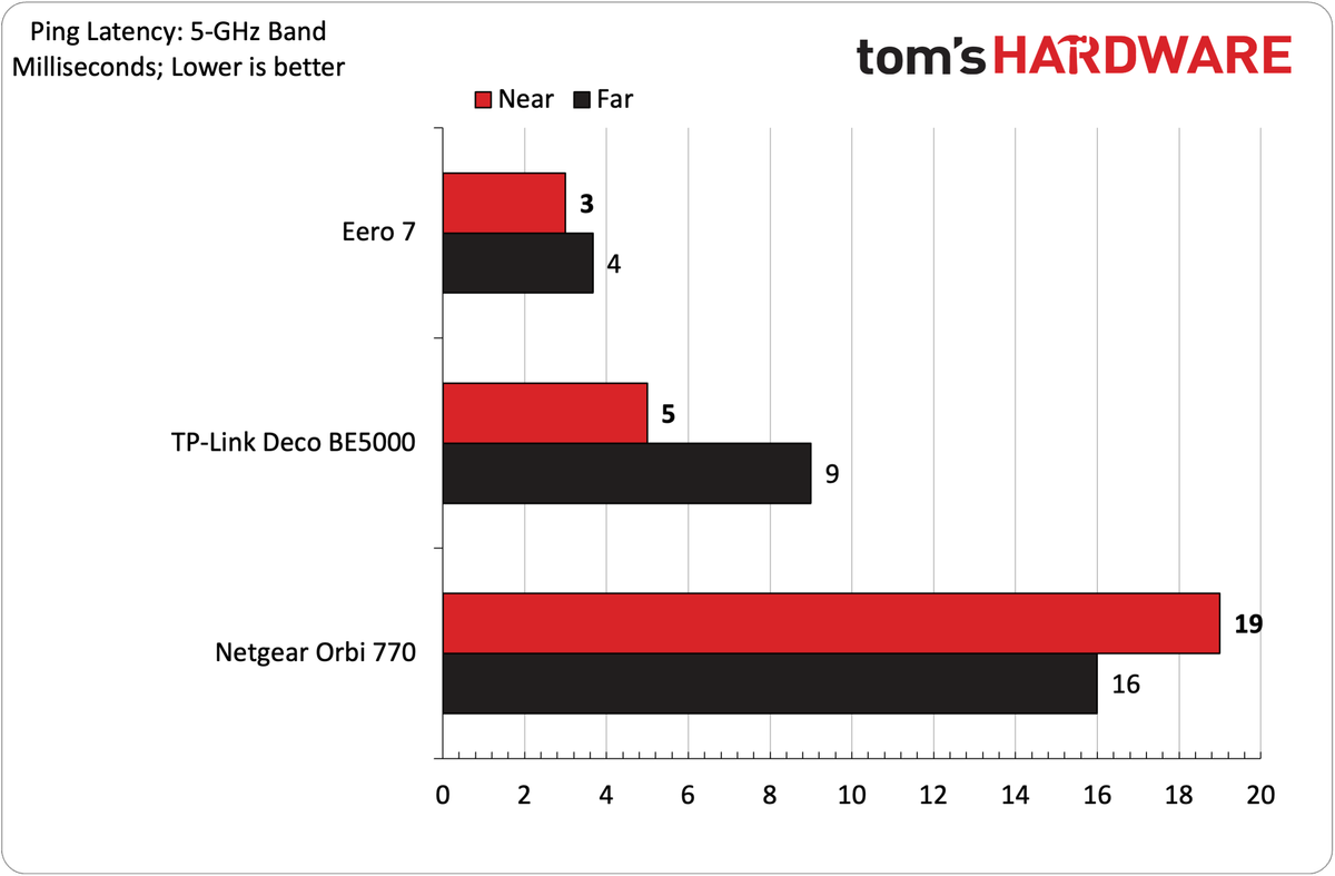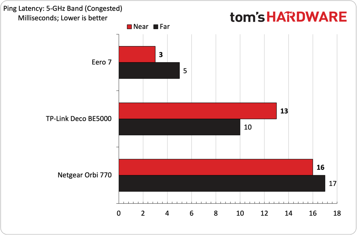 Os tempos de ping foram consistentes em todas as distâncias, bandas e níveis de tráfego, pairando em torno de 7 milissegundos ou menos.