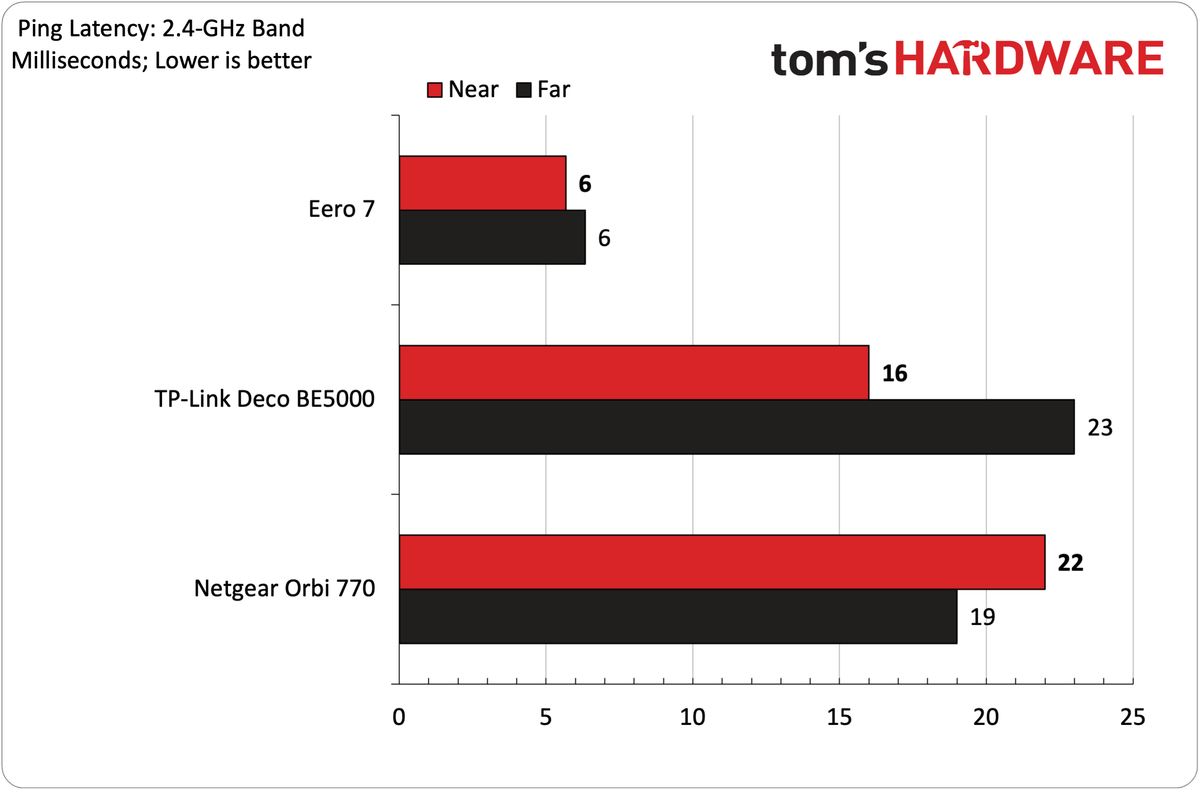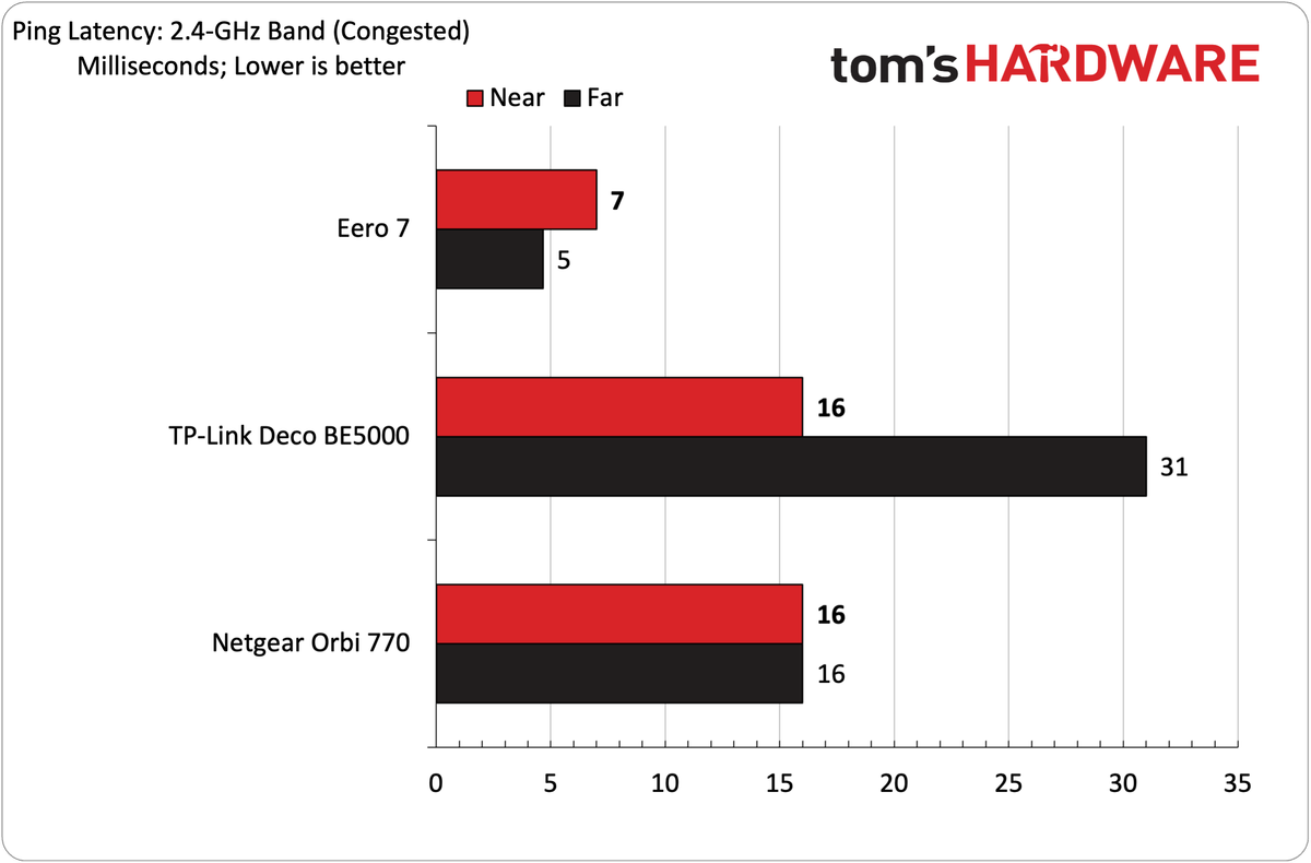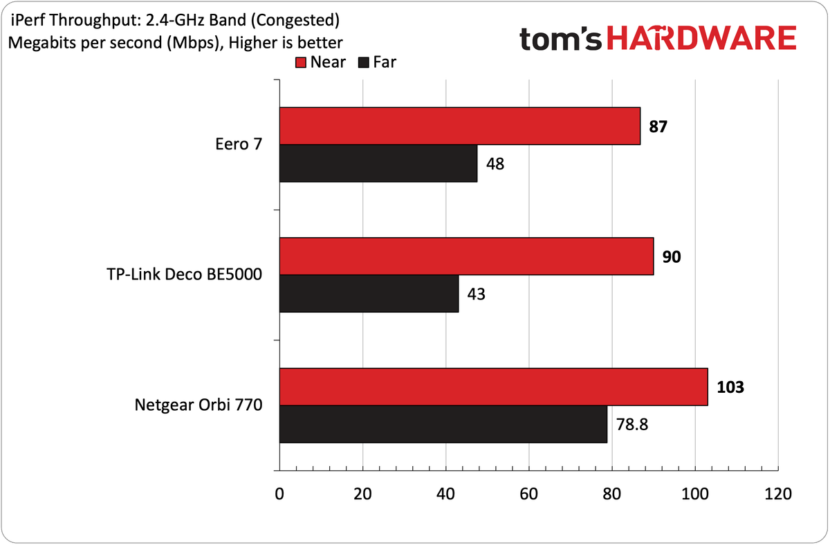 Mudando nossa atenção para o desempenho de 2,4 GHz, medimos 117 Mbps a curto alcance e 57 Mbps a longo prazo com nosso teste IPERF3 não apontado. Isso foi um desempenho um pouco melhor que o DECO BE5000, mas um rebaixamento significativo em comparação com o ORBI 770 (158 Mbps, 92 Mbps). Com o tráfego congestionado, o Eero 7 derramou cerca de 25 % de seu desempenho a um metro e oitenta, trazendo 87 Mbps a seis pés e 48 Mbps a 25 pés.