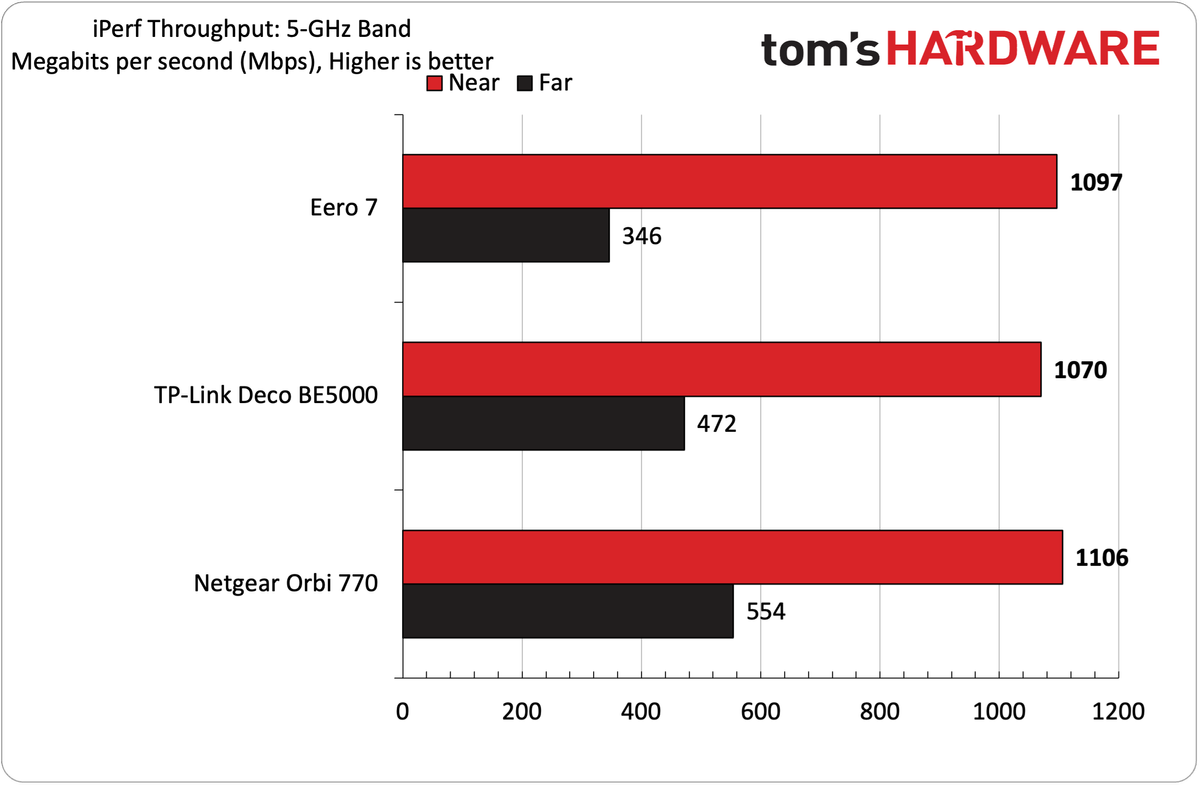No nosso teste de 5 GHz IPERF3, que estava livre e livre de tráfego sem fio adicional, o Eero 7 conseguiu fornecer 1.097 Mbps de perto (seis pés). Isso colocou isso de acordo com o TP-Link Deco Be5000 e o Netgear Orbi 770 – Todos os três estavam bem dentro da margem de erro. Estando -se a 25 pés, o Eero 7 caiu para o terceiro lugar por uma margem bastante grande, fornecendo 346 Mbps em comparação com 472 Mbps e 554 Mbps para o Deco BE5000 e ORBI 770, respectivamente.