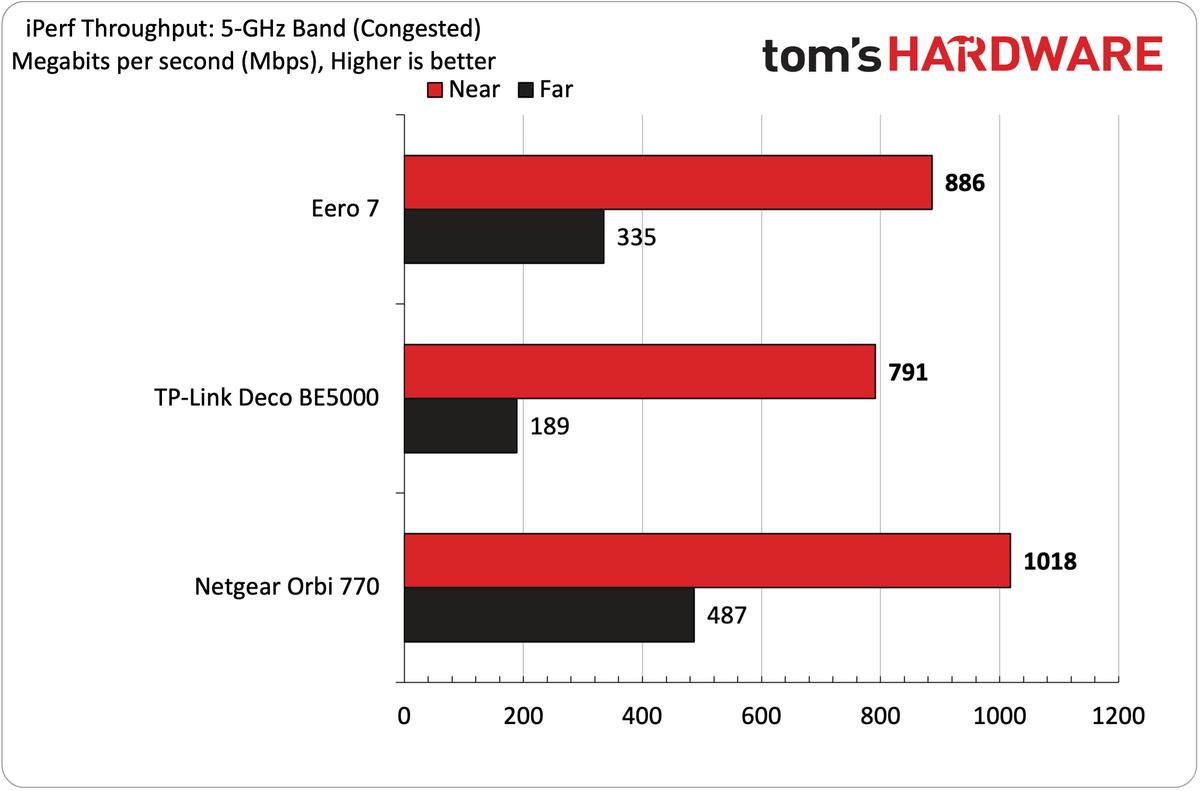 Com o tráfego congestionado, o desempenho de 5 GHz caiu para 886 Mbps a seis pés e 335 Mbps a 25 pés. Isso o colocou bem à frente do DECO BE5000 (791 Mbps e 189 Mbps), mas pouco mais de 100 Mbps a menos do Orbi 770 mais caro, que é um roteador de malha Wi-Fi 7 mais caro).