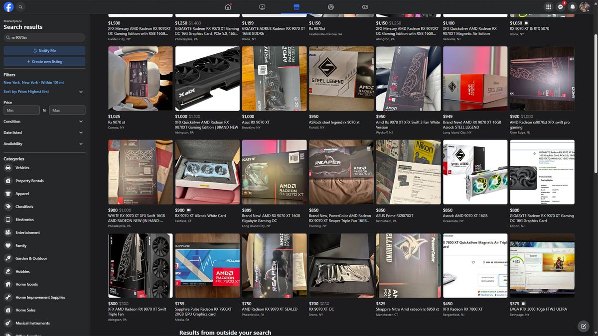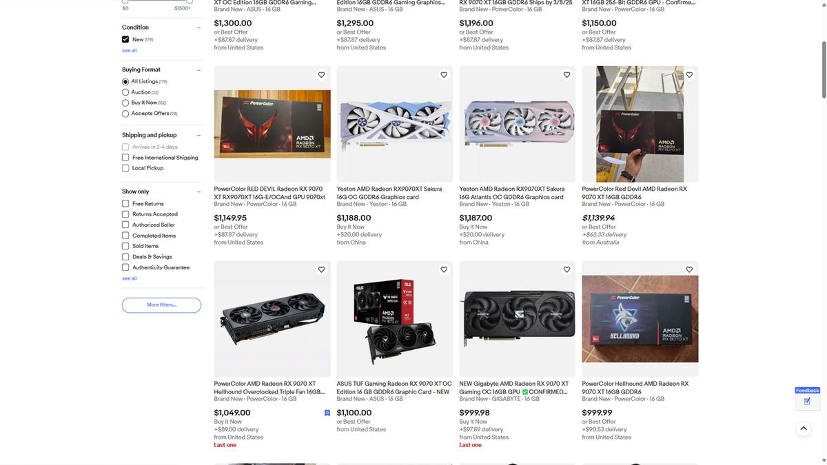Observe que os principais varejistas ou fabricantes não vendem esses itens; Em vez disso, eles são oferecidos por lojas de terceiros com uma loja on-line na plataforma de comércio eletrônico. Surpreendentemente, os cambistas no eBay e no Facebook Marketplace são um pouco mais razoáveis, com muitos pedindo entre US $ 700 e US $ 1.500 por um RX 9070 XT.