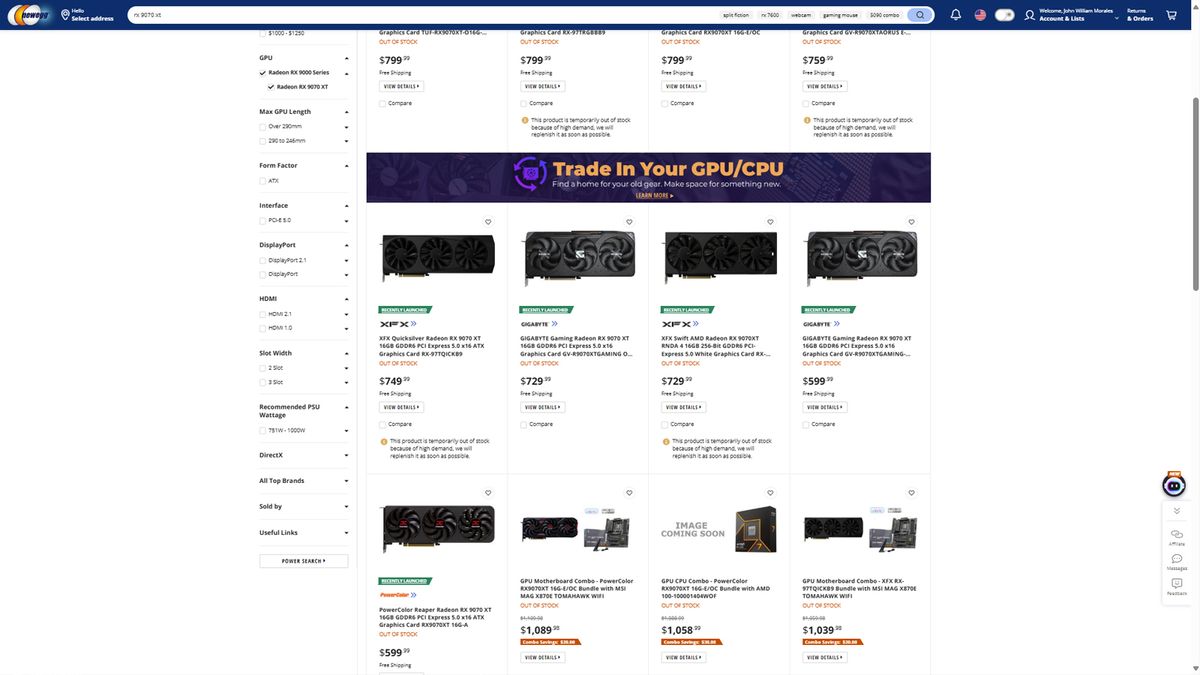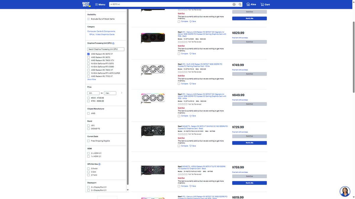 No entanto, parece que a suposta boa oferta das GPUs RDNA4 da AMD não é suficiente para satisfazer as demandas dos jogadores. Olhamos em volta dos principais varejistas de PC, como Micro Center e Newegg, apenas para encontrar quase todas as listagens fora do estoque. Até a Best Buy está esgotada principalmente, portanto, mesmo que você saiba onde comprar as GPUs da série AMD Radeon RX 9070, provavelmente não as encontrará disponíveis agora.