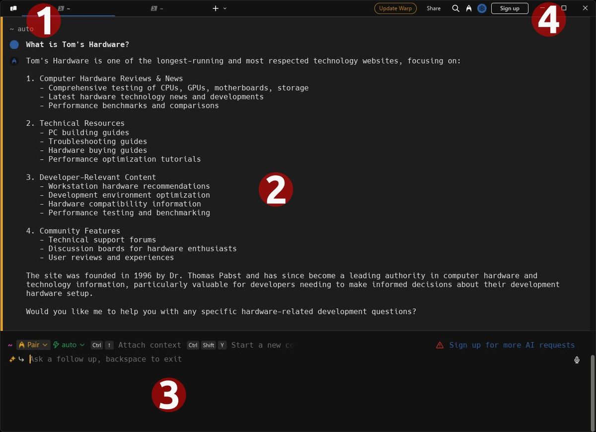 A Warp é um terminal, mas é apoiado por um serviço de IA baseado em nuvem que pode ser usado para interagir com o sistema operacional subjacente e criar código em uma infinidade de idiomas. A Warp oferece um serviço pago, mas você pode obter com o plano gratuito.