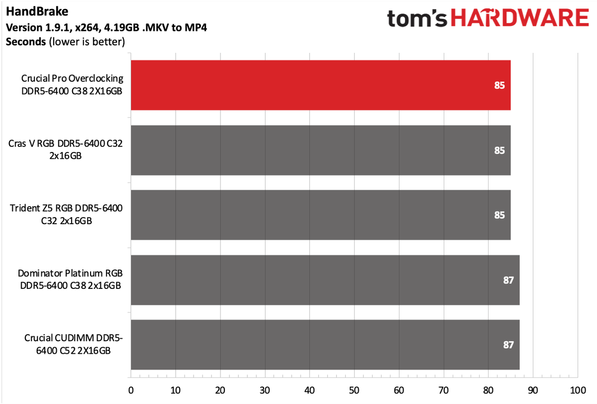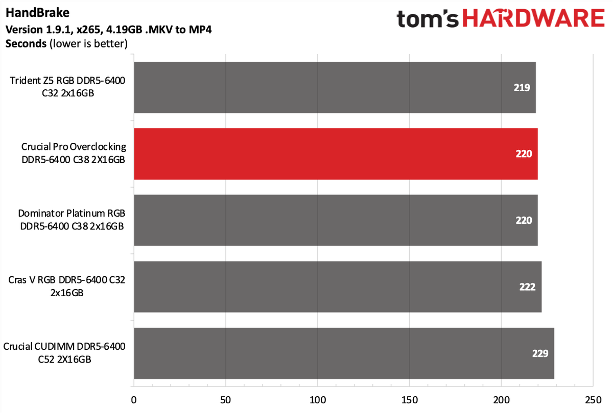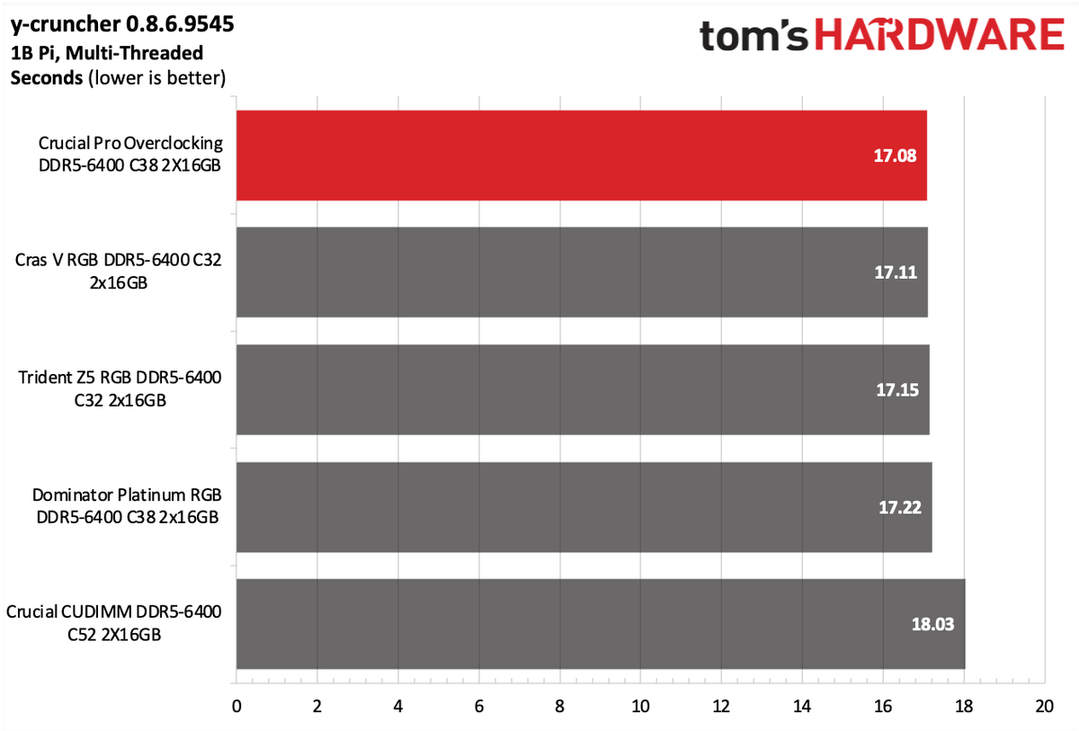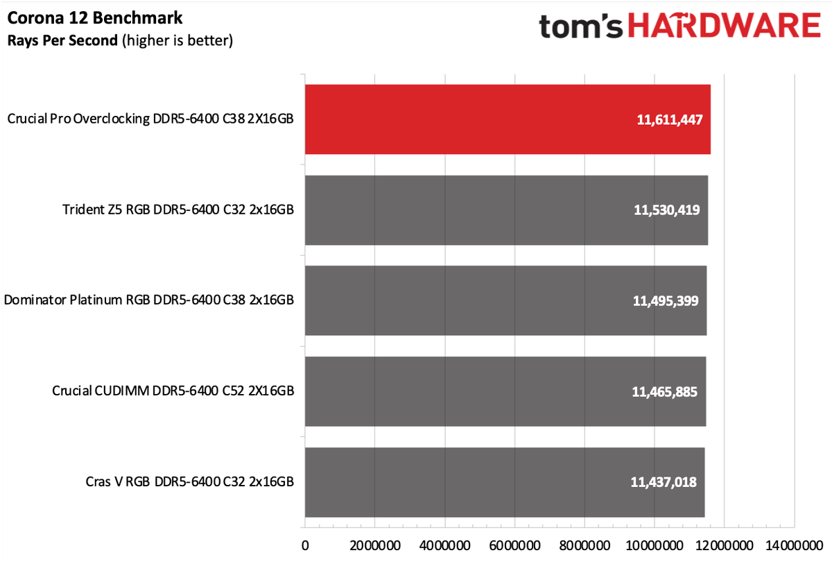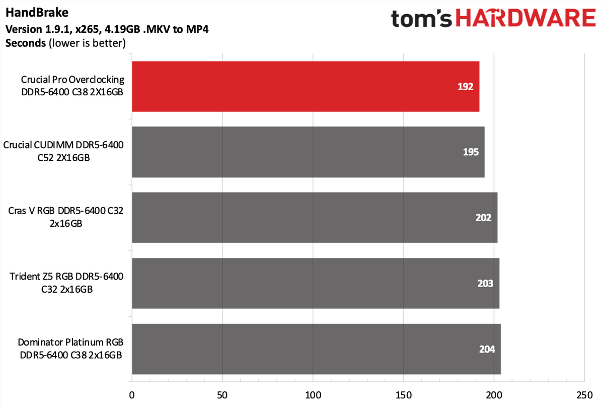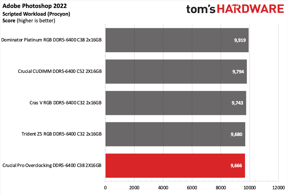 O kit de memória da Crucial continuou a liderar o desempenho do aplicativo na plataforma AMD x870. Ele mostrou com confiança suas proezas em benchmarks, incluindo Applications Adobe, Corona 12, Handbrake e Y-Cruncher. Em contraste com a plataforma Intel, a memória de overclock do Pro emergiu como o kit de desempenho superior para jogos na plataforma AMD.