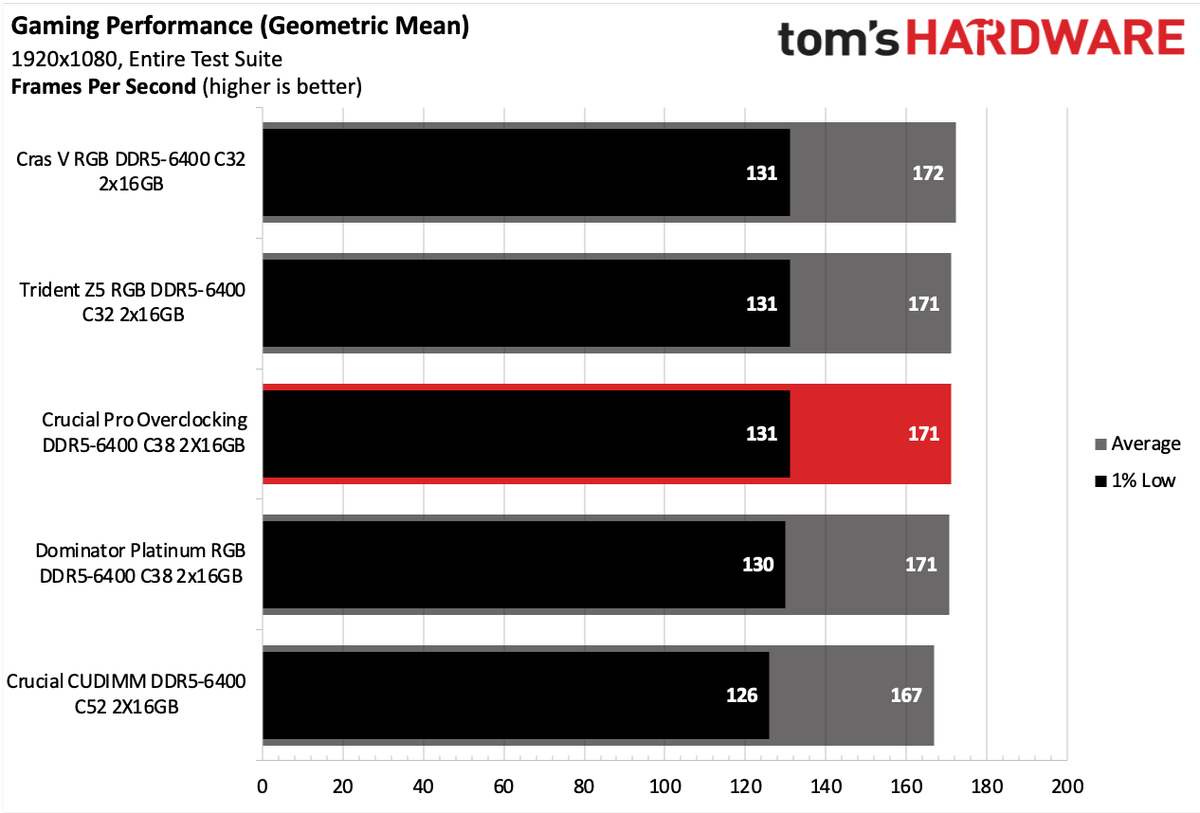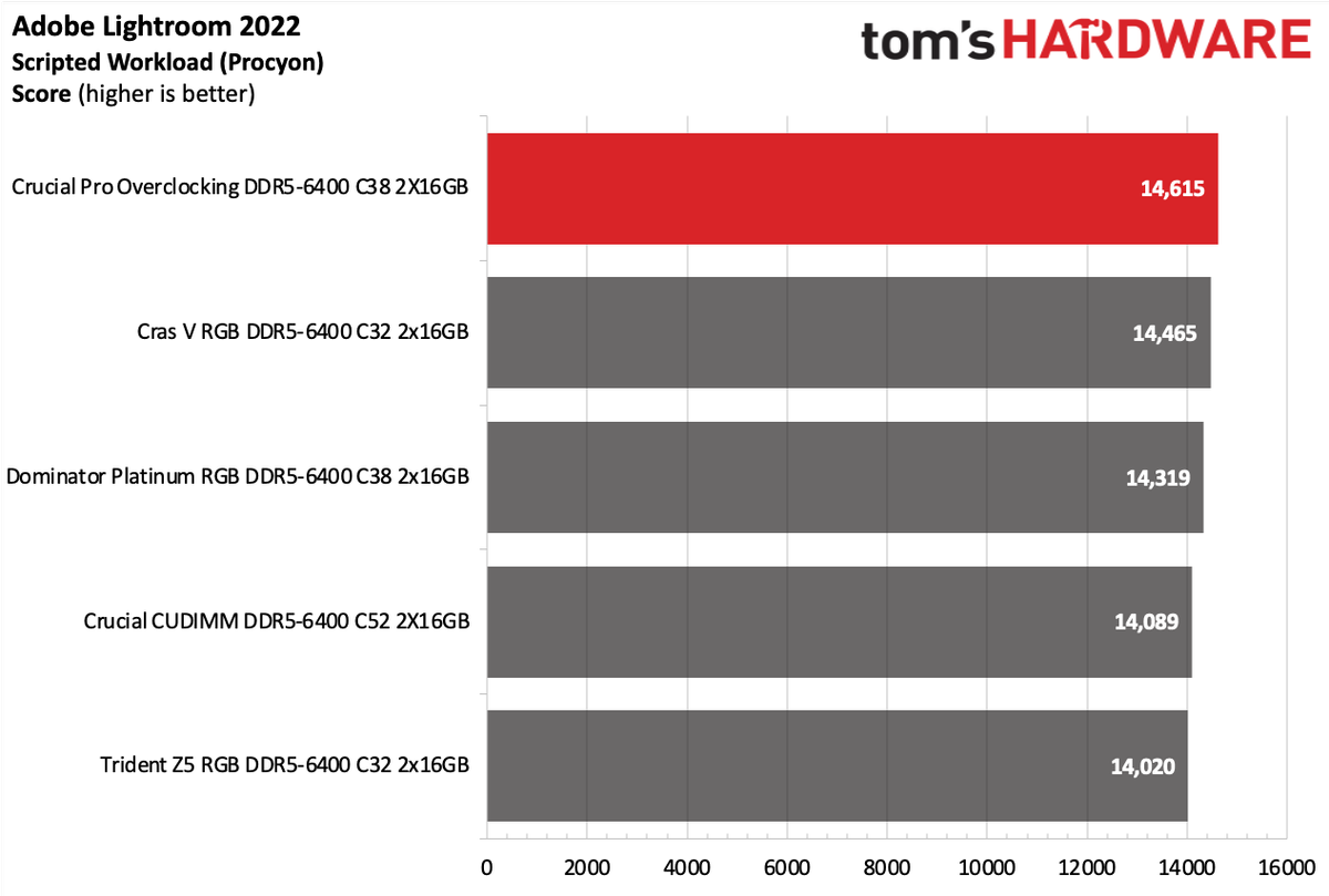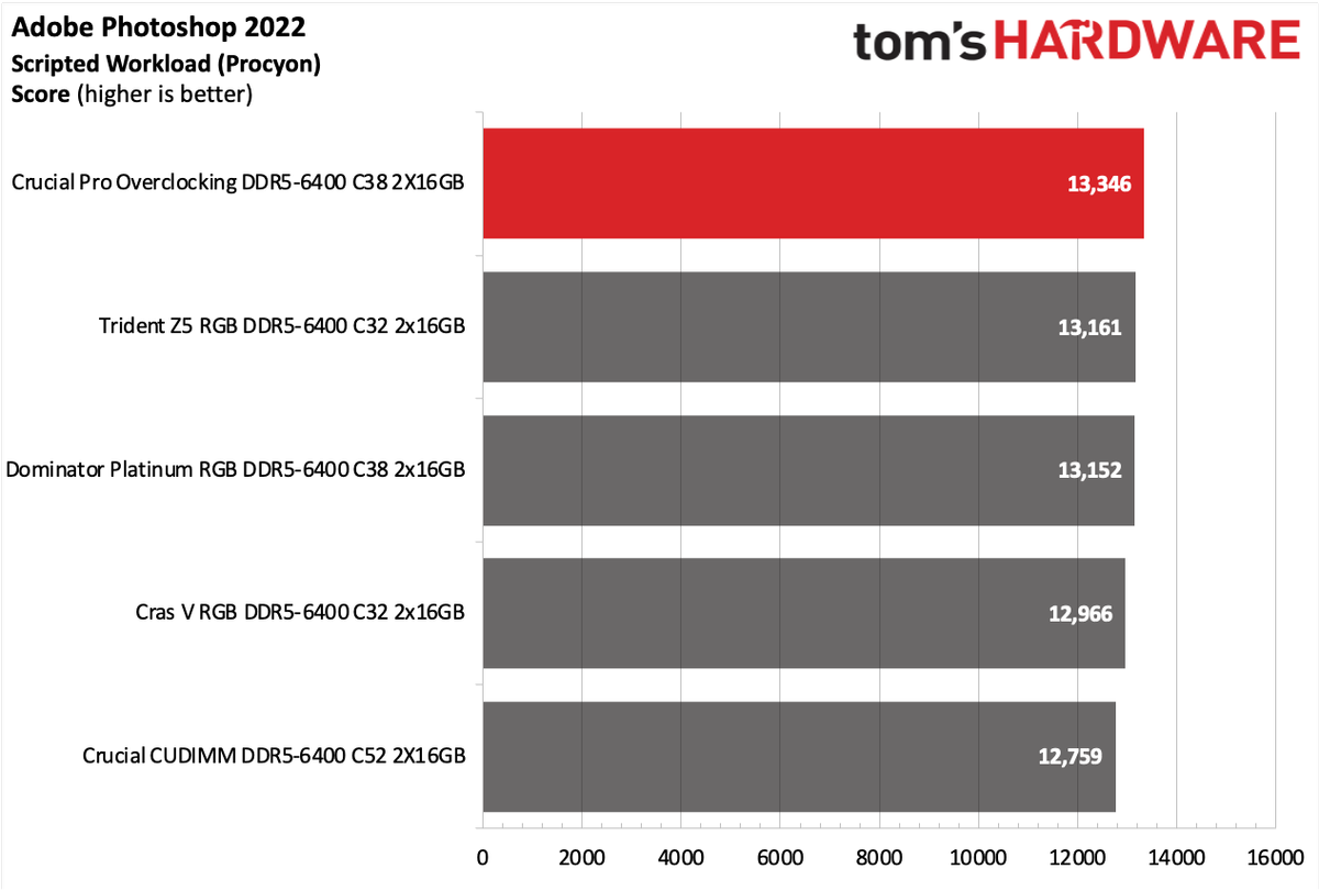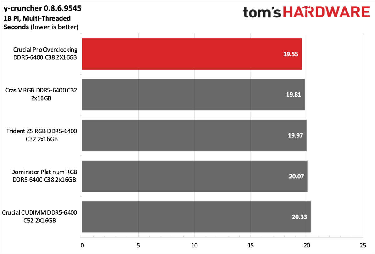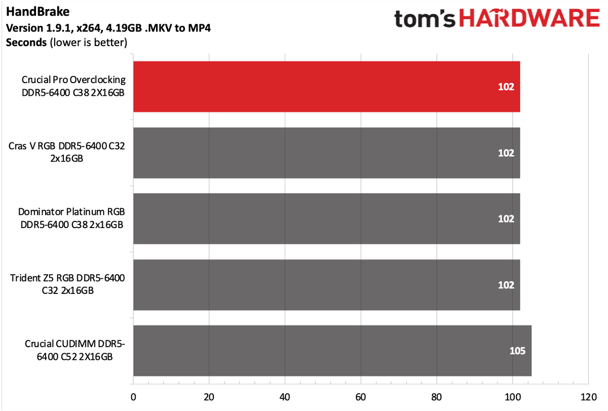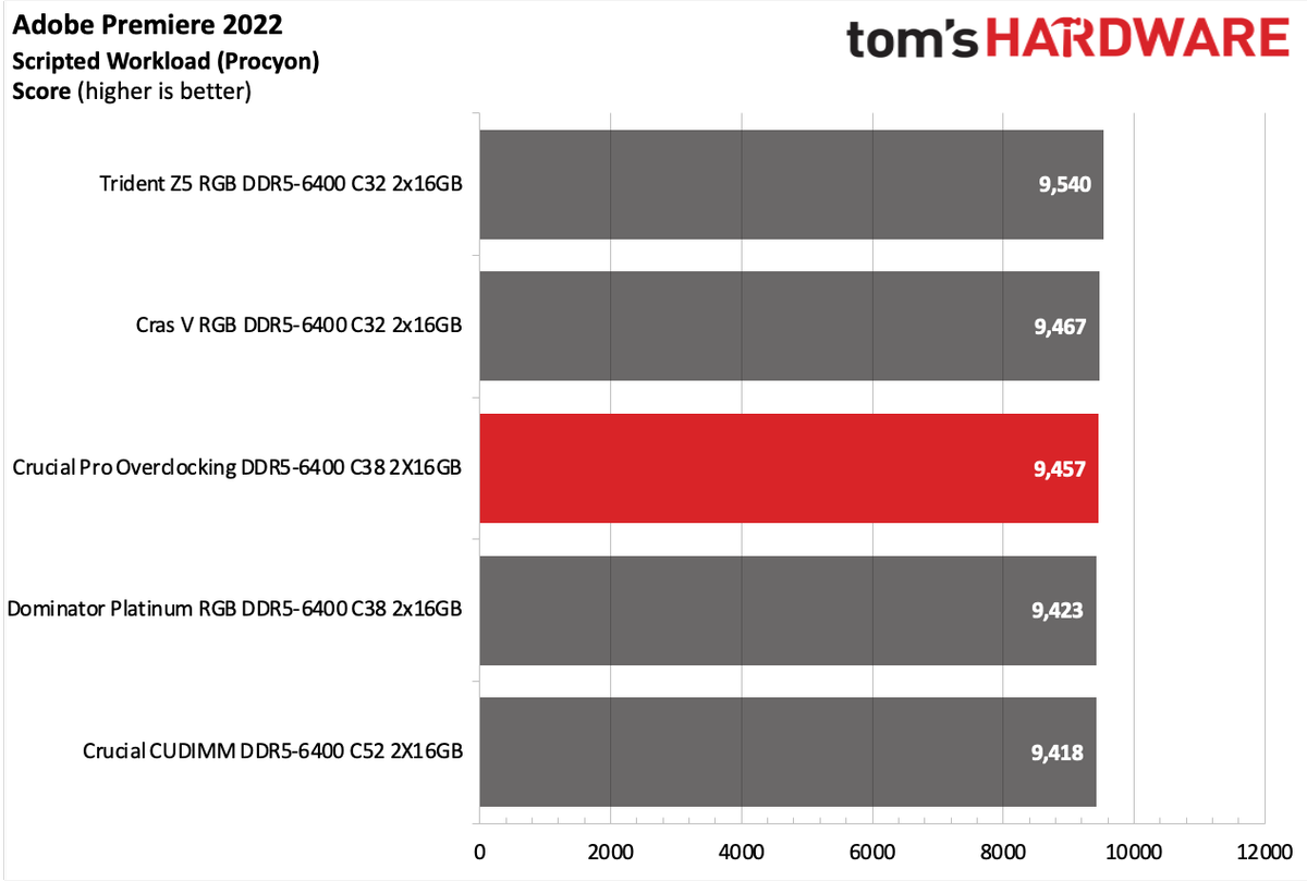 O kit de memória da Crucial continuou a liderar o desempenho do aplicativo na plataforma AMD x870. Ele mostrou com confiança suas proezas em benchmarks, incluindo Applications Adobe, Corona 12, Handbrake e Y-Cruncher. Em contraste com a plataforma Intel, a memória de overclock do Pro emergiu como o kit de desempenho superior para jogos na plataforma AMD.