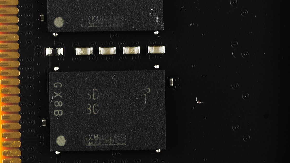 Devido ao adesivo resistente, a remoção do espalhador de calor foi desafiadora. Reunindo as várias pequenas marcações, o crucial utiliza os 4SD75 D8GVH ICS, que são efetivamente os chips D-Die da empresa. Estamos analisando um design de rank único e um layout de um lado com oito ICs de 2 GB em um lado da PCB preta. Identificamos o IC de gerenciamento de energia (PMIC) como o 0H = 9J T3Q Chip de Richtek.