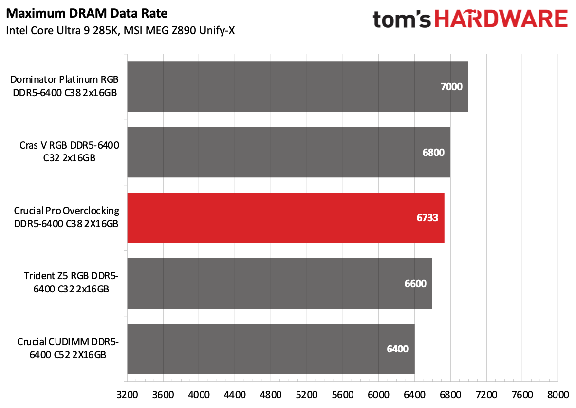 Aumentar a tensão de 1,35V para 1,45V permitiu o overclock do PRO para obter DDR5-6733 de DDR5-6400, mantendo os horários exatos de 38-40-40-84. O kit de memória crucial superou o Trident Z5 RGB DDR5-6400 C32 da G.Skill em overclock, embora o último apresente horários de memória superior (32-39-39-102) em DDR5-6600.