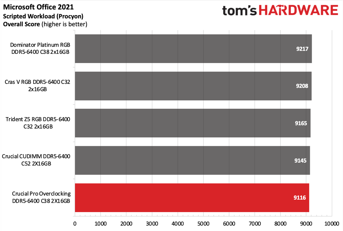 O kit de memória de overclock do Pro exibiu um desempenho poderoso em diferentes cargas de trabalho de aplicativos. Seus destaques notáveis incluem o Microsoft Office 2021, a descompressão de 7-ZIP, a conversão do freio de mão e o Y-Cruncher. No entanto, o kit de memória classificado no meio do pacote relativo do desempenho dos jogos.