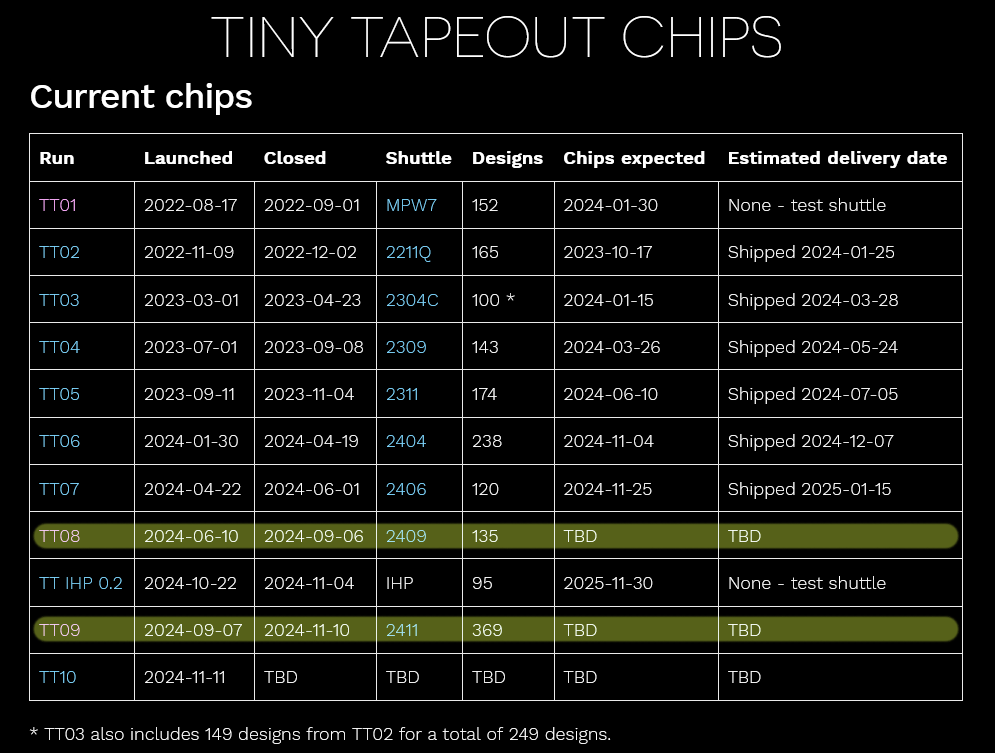 A participação nos pequenos programas de fitas já exigia muita paciência. Por exemplo, o TT08 acima mencionado foi lançado em 10 de junho de 2024, com as inscrições fechadas no início de setembro. Esperava -se que os chips estivessem prontos em abril deste ano, com PCBs enviados aos respectivos autores do projeto de maio. TT08 incluiu 135 projetos. O mais recente TT09 apresentou quase 370 projetos.